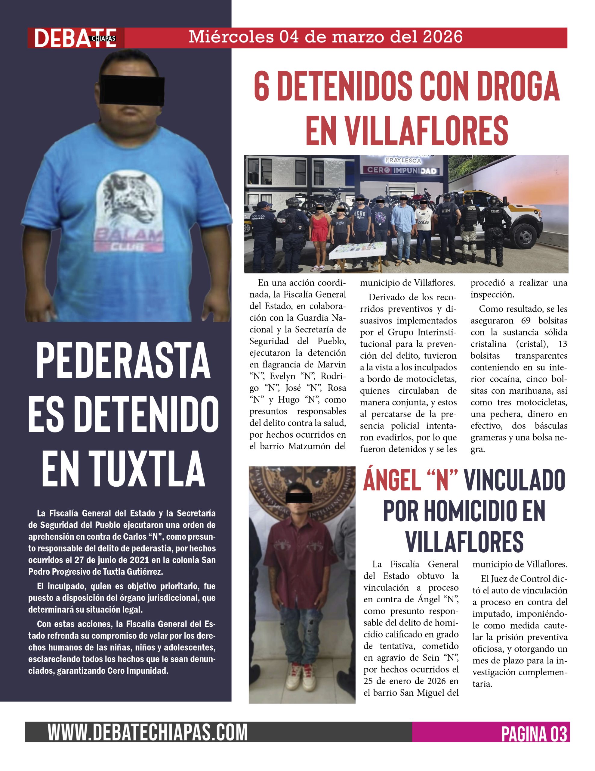 La Fiscalía General del Estado y la Secretaría de Seguridad del Pueblo ejecutaron una orden de aprehensión en contra de Carlos “N”, como presunto responsable del delito de pederastia, por hechos ocurridos el 27 de junio de 2021 en la colonia San Pedro Progresivo de Tuxtla Gutiérrez.