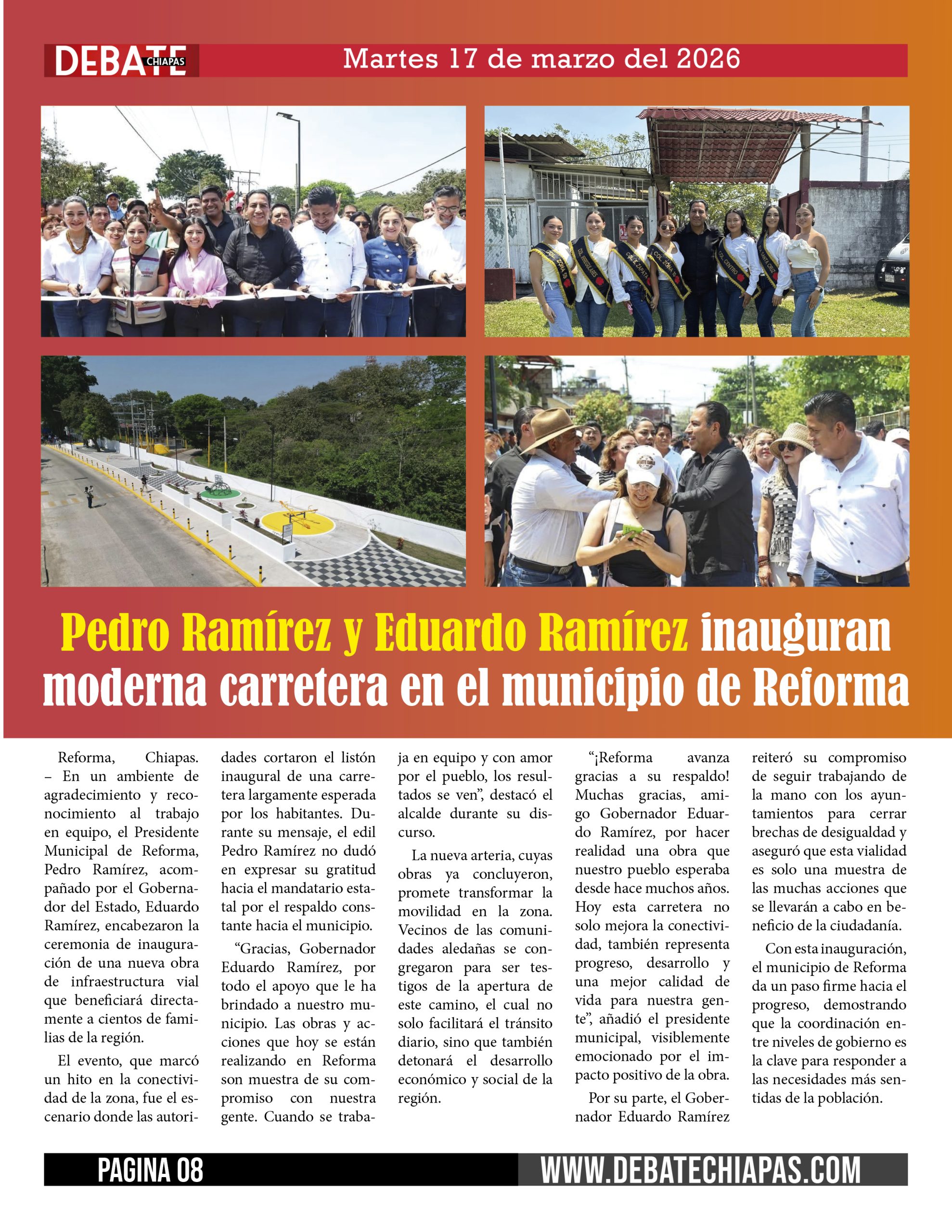 Reforma, Chiapas. – En un ambiente de agradecimiento y reconocimiento al trabajo en equipo, el Presidente Municipal de Reforma, Pedro Ramírez, acompañado por el Gobernador del Estado, Eduardo Ramírez, encabezaron la ceremonia de inauguración de una nueva obra de infraestructura vial que beneficiará directamente a cientos de familias de la región.