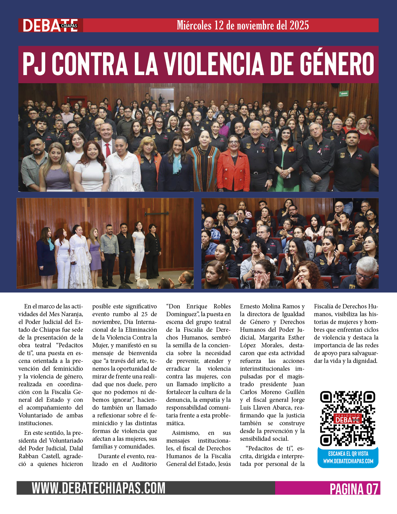 En el marco de las actividades del Mes Naranja, el Poder Judicial del Estado de Chiapas fue sede de la presentación de la obra teatral “Pedacitos de ti”, una puesta en escena orientada a la prevención del feminicidio y la violencia de género, realizada en coordinación con la Fiscalía General del Estado y con el acompañamiento del Voluntariado de ambas instituciones.