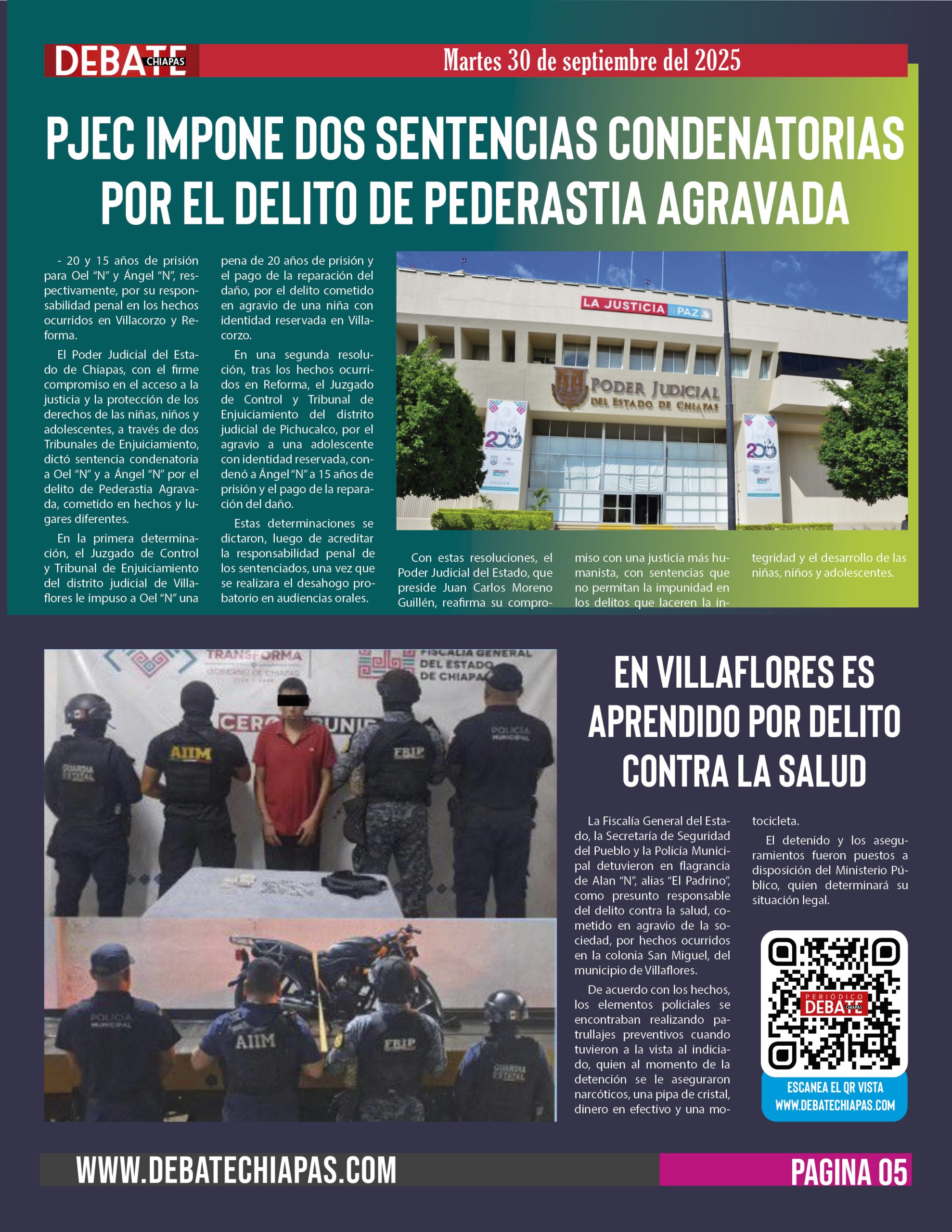 El Poder Judicial del Estado de Chiapas, con el firme compromiso en el acceso a la justicia y la protección de los derechos de las niñas, niños y adolescentes, a través de dos Tribunales de Enjuiciamiento, dictó sentencia condenatoria a Oel “N” y a Ángel “N” por el delito de Pederastia Agravada, cometido en hechos y lugares diferentes.