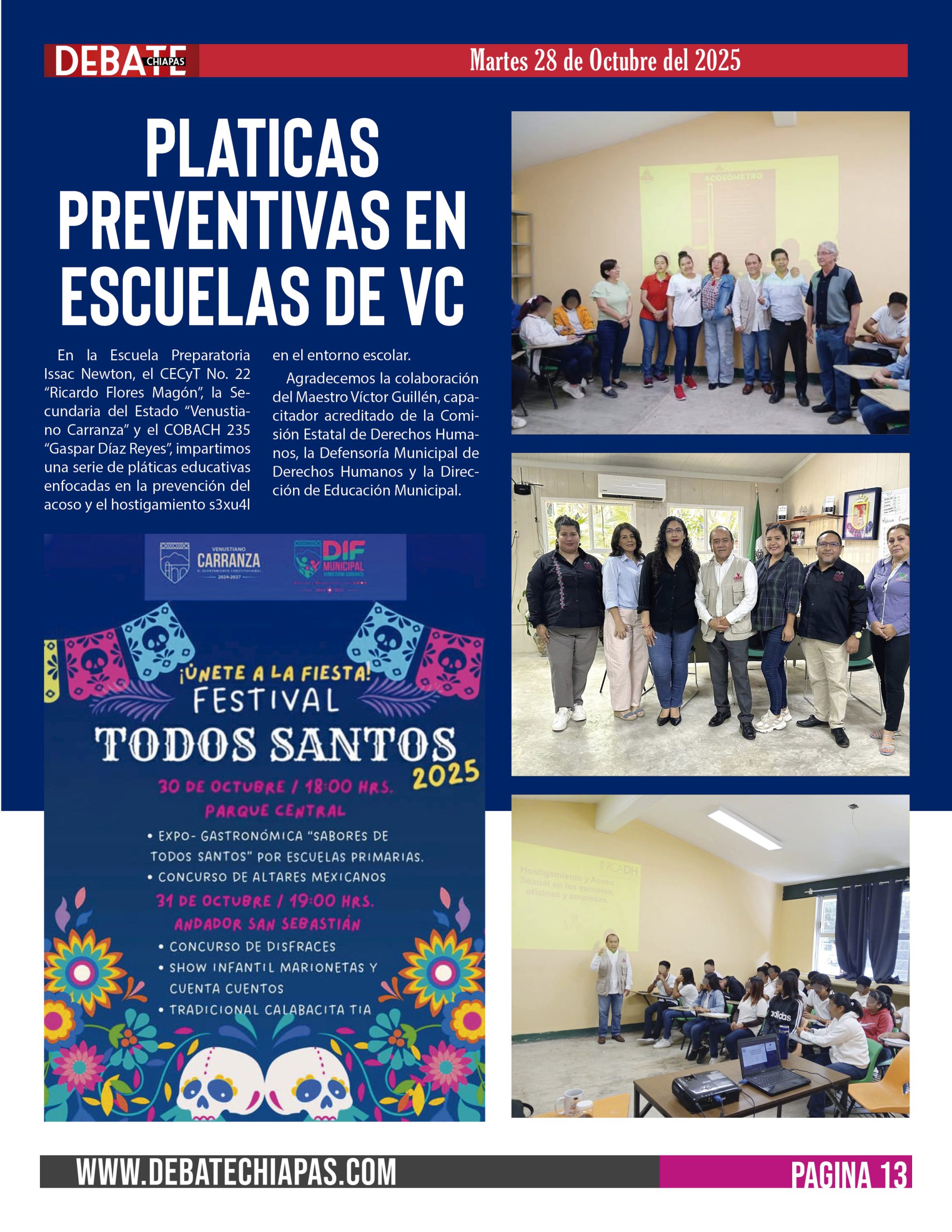 En la Escuela Preparatoria Issac Newton, el CECyT No. 22 «Ricardo Flores Magón», la Secundaria del Estado «Venustiano Carranza» y el COBACH 235 «Gaspar Díaz Reyes», impartimos una serie de pláticas educativas enfocadas en la prevención del acoso y el hostigamiento s3xu4l en el entorno escolar.