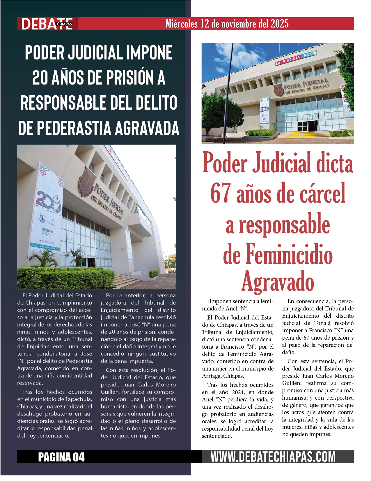 El Poder Judicial del Estado de Chiapas, en cumplimiento con el compromiso del acceso a la justicia y la protección integral de los derechos de las niñas, niños y adolescentes, dictó, a través de un Tribunal de Enjuiciamiento, una sentencia condenatoria a José “N”, por el delito de Pederastia Agravada, cometido en contra de una niña con identidad reservada.
