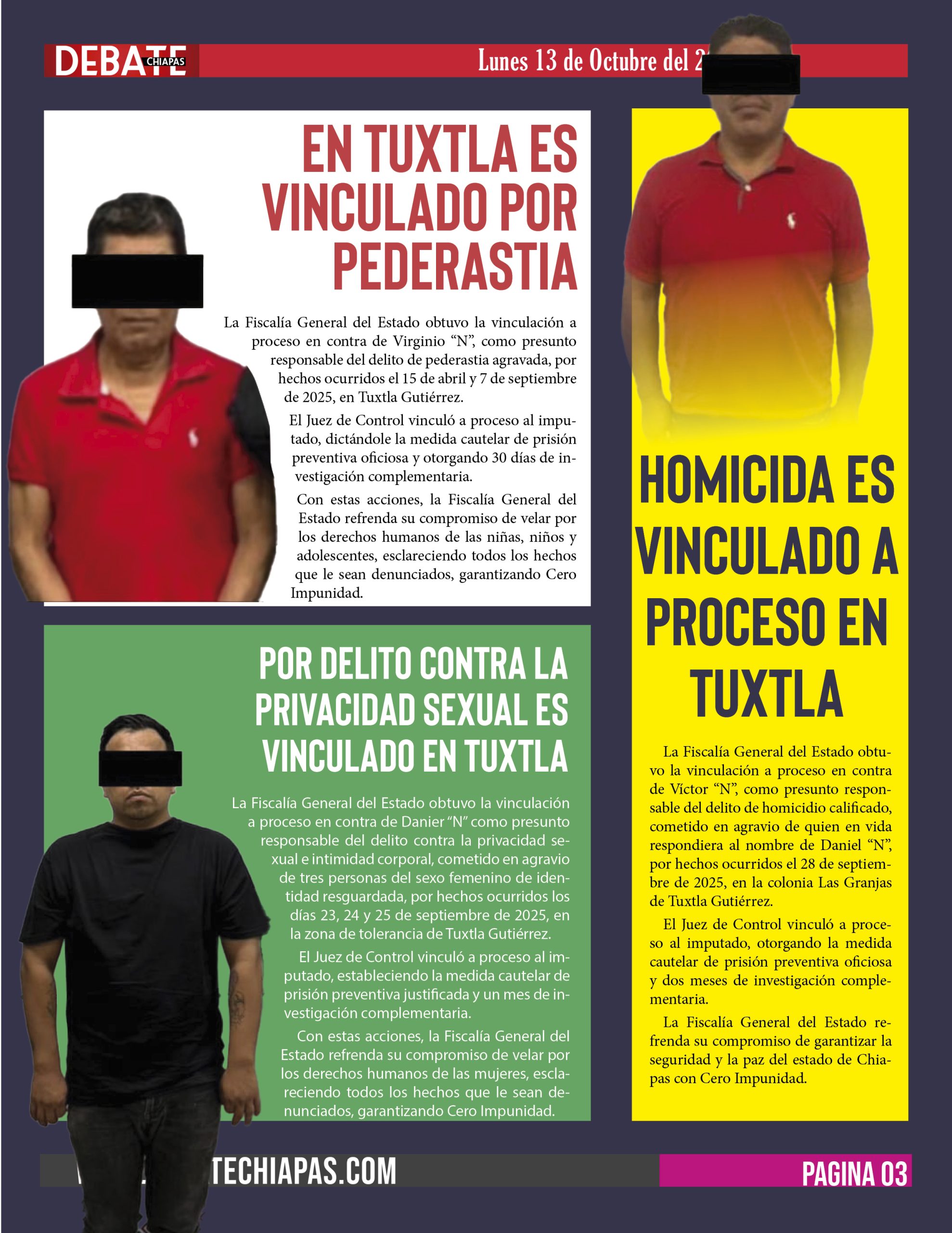 La Fiscalía General del Estado obtuvo la vinculación a proceso en contra de Danier “N” como presunto responsable del delito contra la privacidad sexual e intimidad corporal, cometido en agravio de tres personas del sexo femenino de identidad resguardada, por hechos ocurridos los días 23, 24 y 25 de septiembre de 2025, en la zona de tolerancia de Tuxtla Gutiérrez.