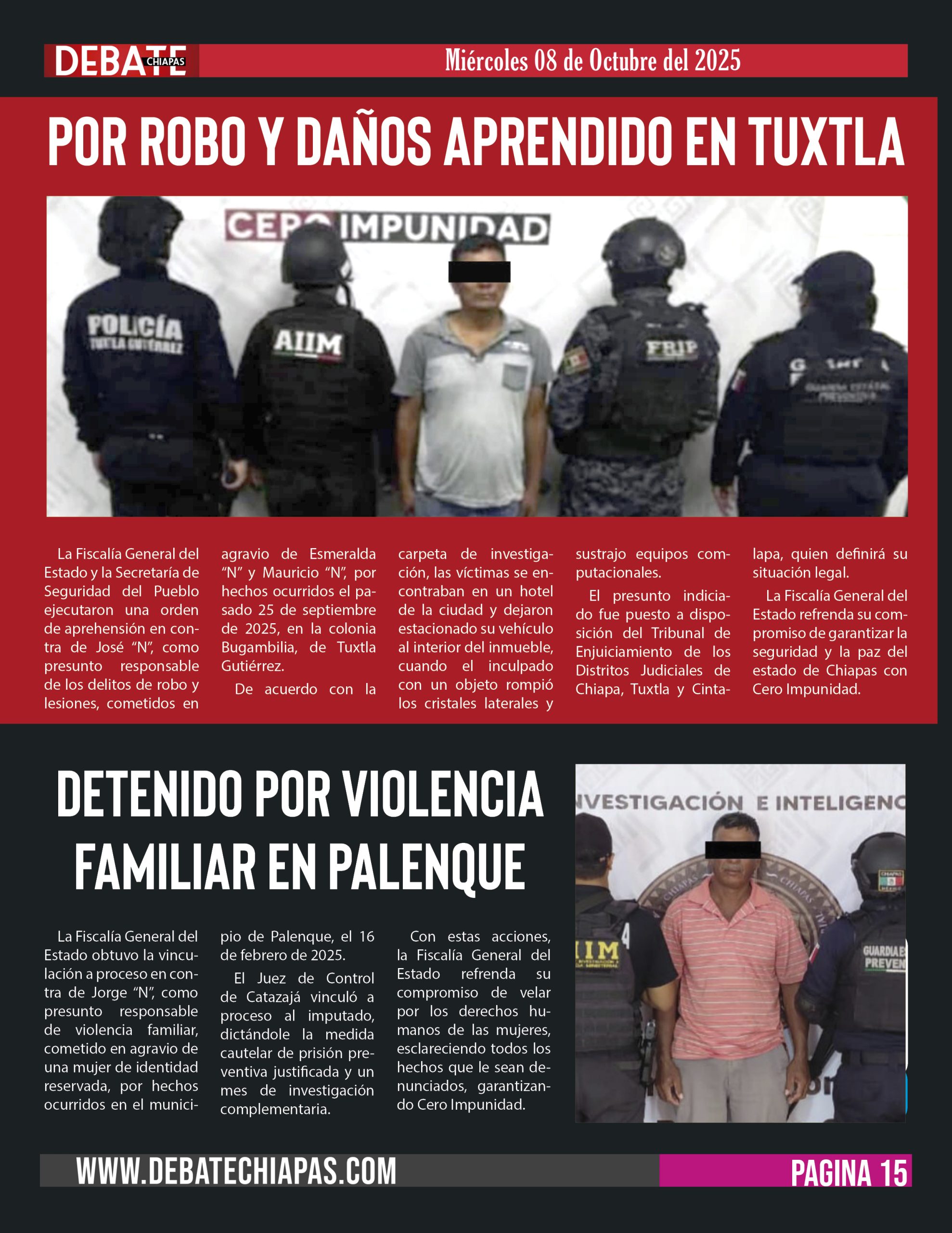 La Fiscalía General del Estado y la Secretaría de Seguridad del Pueblo ejecutaron una orden de aprehensión en contra de José “N”, como presunto responsable de los delitos de robo y lesiones, cometidos en agravio de Esmeralda “N” y Mauricio “N”, por hechos ocurridos el pasado 25 de septiembre de 2025, en la colonia Bugambilia, de Tuxtla Gutiérrez.