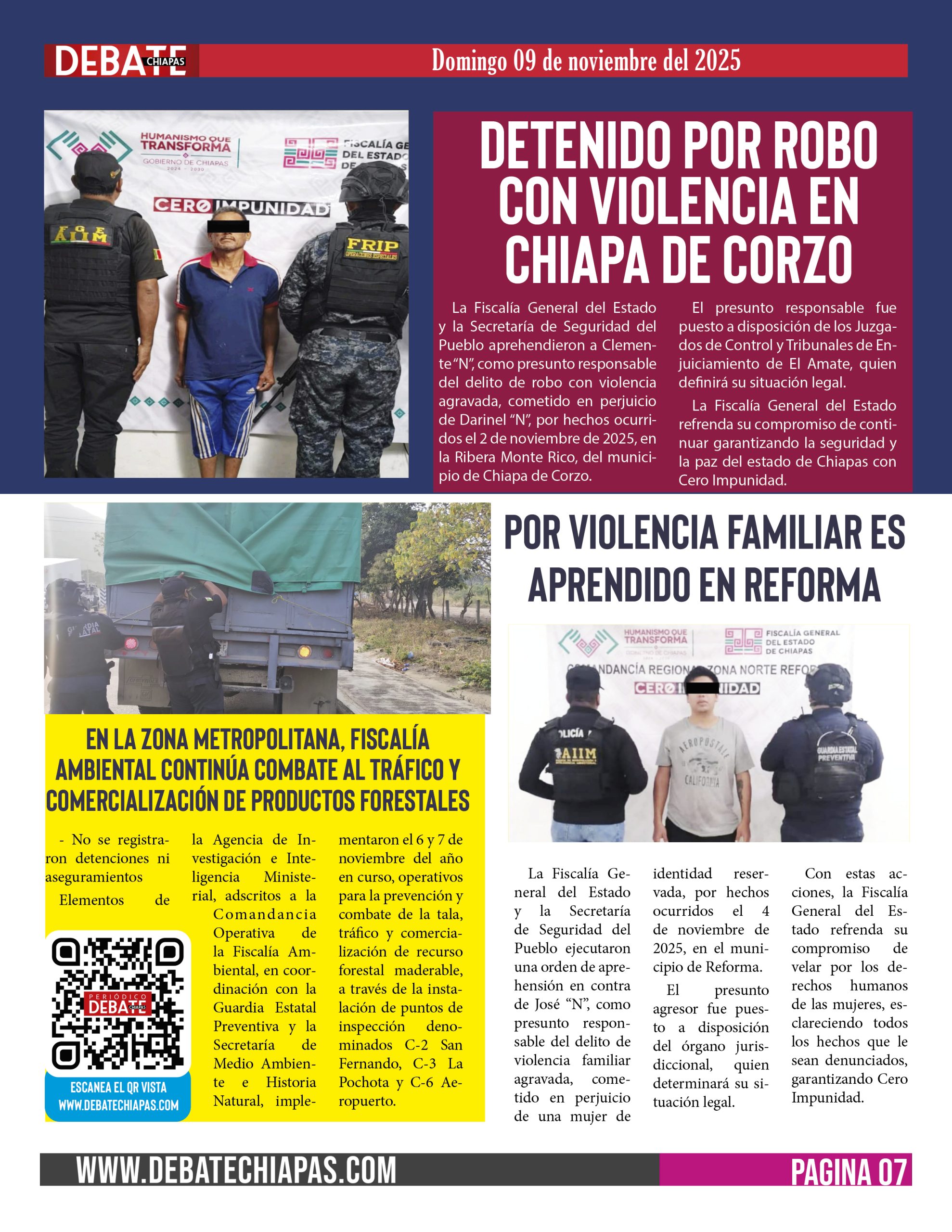 La Fiscalía General del Estado y la Secretaría de Seguridad del Pueblo ejecutaron una orden de aprehensión en contra de José “N”, como presunto responsable del delito de violencia familiar agravada, cometido en perjuicio de una mujer de identidad reservada, por hechos ocurridos el 4 de noviembre de 2025, en el municipio de Reforma.