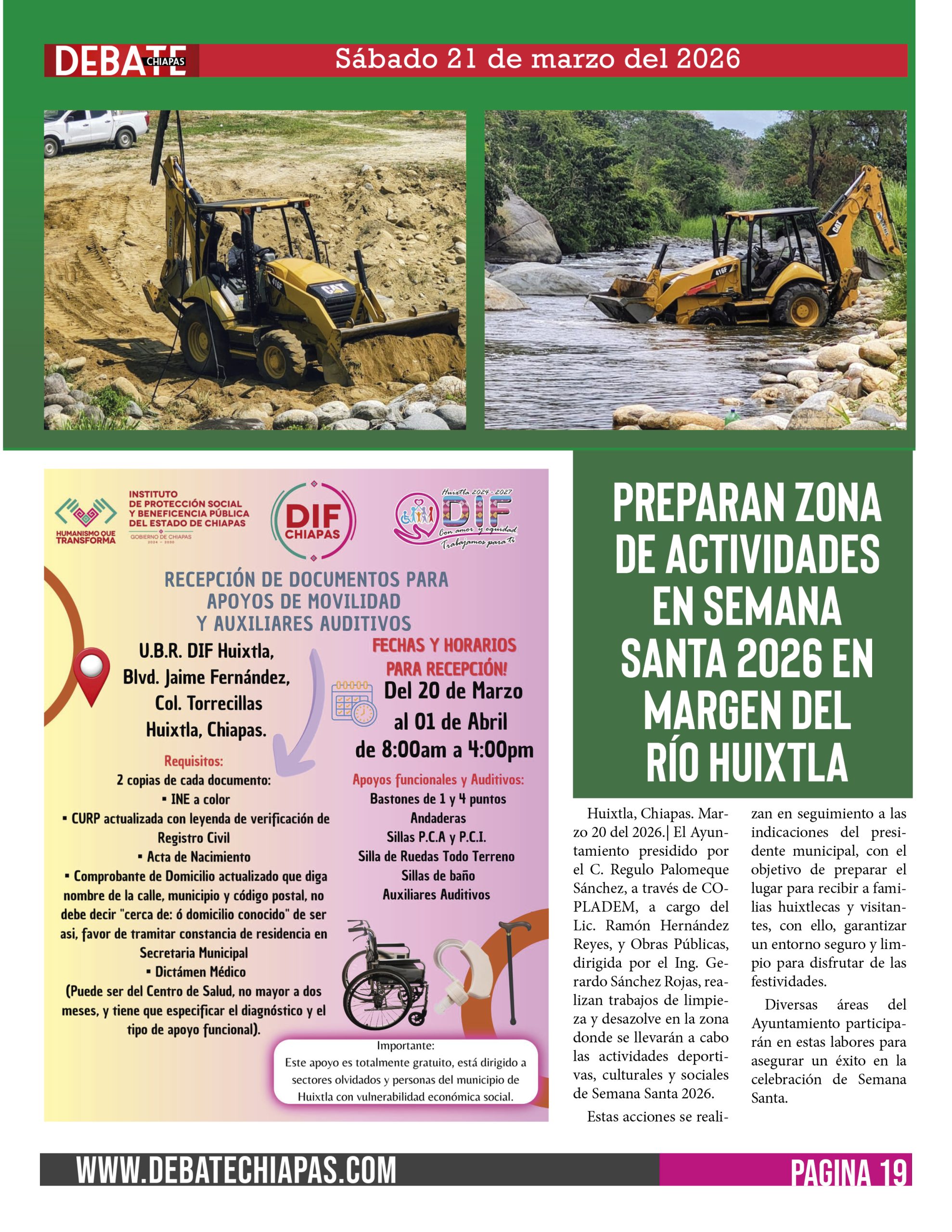 Huixtla, Chiapas. Marzo 20 del 2026.| El Ayuntamiento presidido por el C. Regulo Palomeque Sánchez, a través de COPLADEM, a cargo del Lic. Ramón Hernández Reyes, y Obras Públicas, dirigida por el Ing. Gerardo Sánchez Rojas, realizan trabajos de limpieza y desazolve en la zona donde se llevarán a cabo las actividades deportivas, culturales y sociales de Semana Santa 2026.