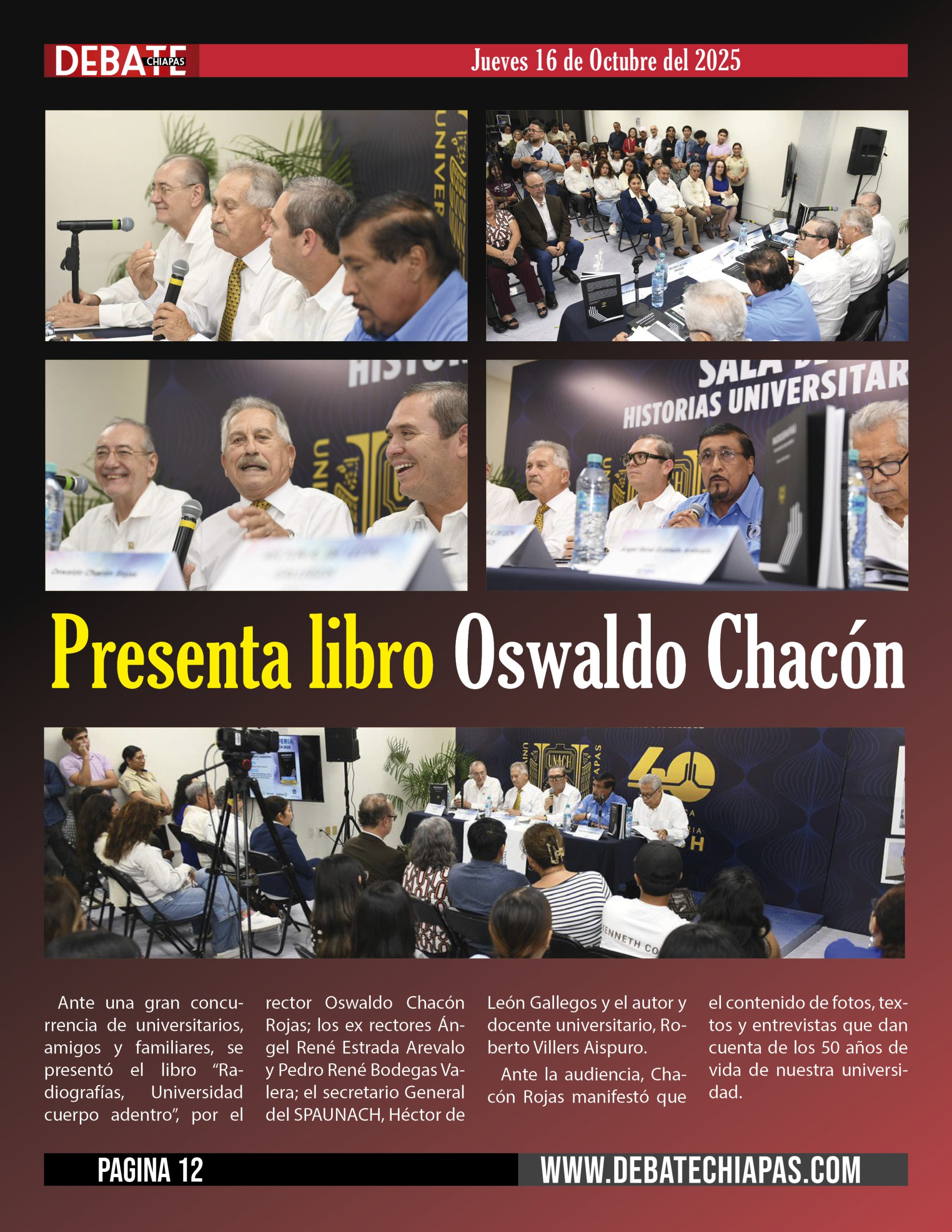 Ante una gran concurrencia de universitarios, amigos y familiares, se presentó el libro “Radiografías, Universidad cuerpo adentro”, por el rector Oswaldo Chacón Rojas; los ex rectores Ángel René Estrada Arevalo y Pedro René Bodegas Valera; el secretario General del SPAUNACH, Héctor de León Gallegos y el autor y docente universitario, Roberto Villers Aispuro.