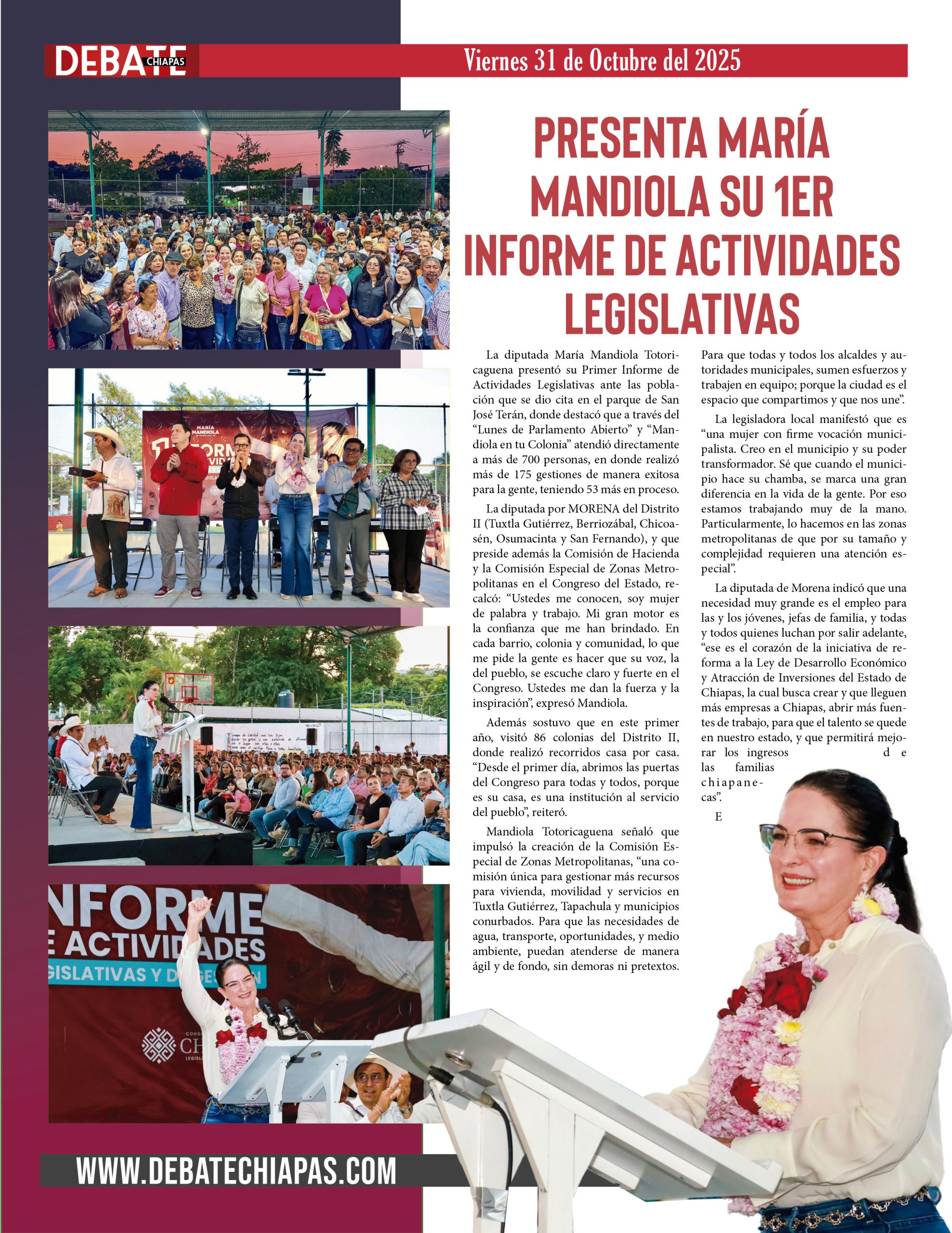 La diputada por MORENA del Distrito II (Tuxtla Gutiérrez, Berriozábal, Chicoasén, Osumacinta y San Fernando), y que preside además la Comisión de Hacienda y la Comisión Especial de Zonas Metropolitanas en el Congreso del Estado, recalcó: “Ustedes me conocen, soy mujer de palabra y trabajo. Mi gran motor es la confianza que me han brindado. En cada barrio, colonia y comunidad, lo que me pide la gente es hacer que su voz, la del pueblo, se escuche claro y fuerte en el Congreso. Ustedes me dan la fuerza y la inspiración”, expresó Mandiola.