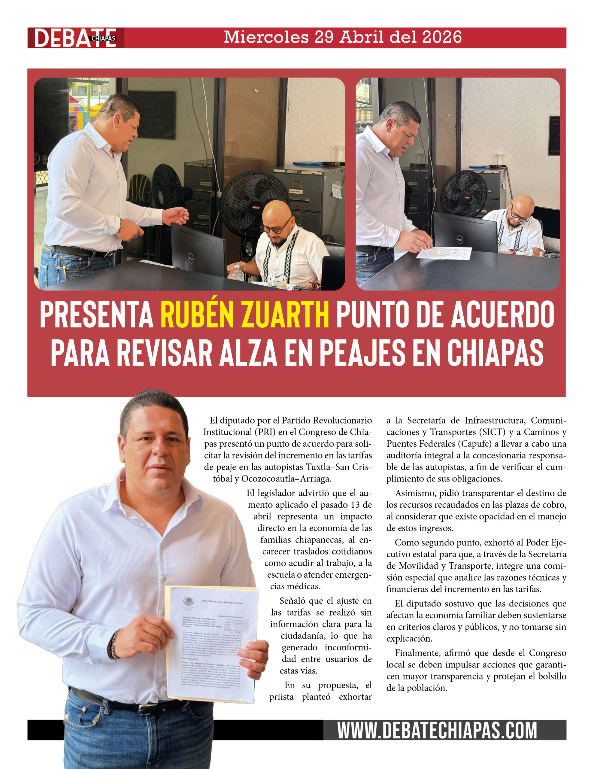 El diputado por el Partido Revolucionario Institucional (PRI) en el Congreso de Chiapas presentó un punto de acuerdo para solicitar la revisión del incremento en las tarifas de peaje en las autopistas Tuxtla–San Cristóbal y Ocozocoautla–Arriaga.