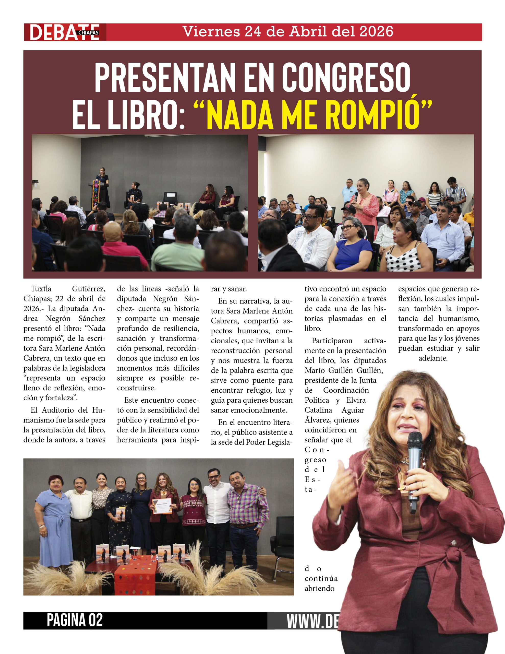 Tuxtla Gutiérrez, Chiapas; 22 de abril de 2026.- La diputada Andrea Negrón Sánchez presentó el libro: “Nada me rompió”, de la escritora Sara Marlene Antón Cabrera, un texto que en palabras de la legisladora “representa un espacio lleno de reflexión, emoción y fortaleza”.