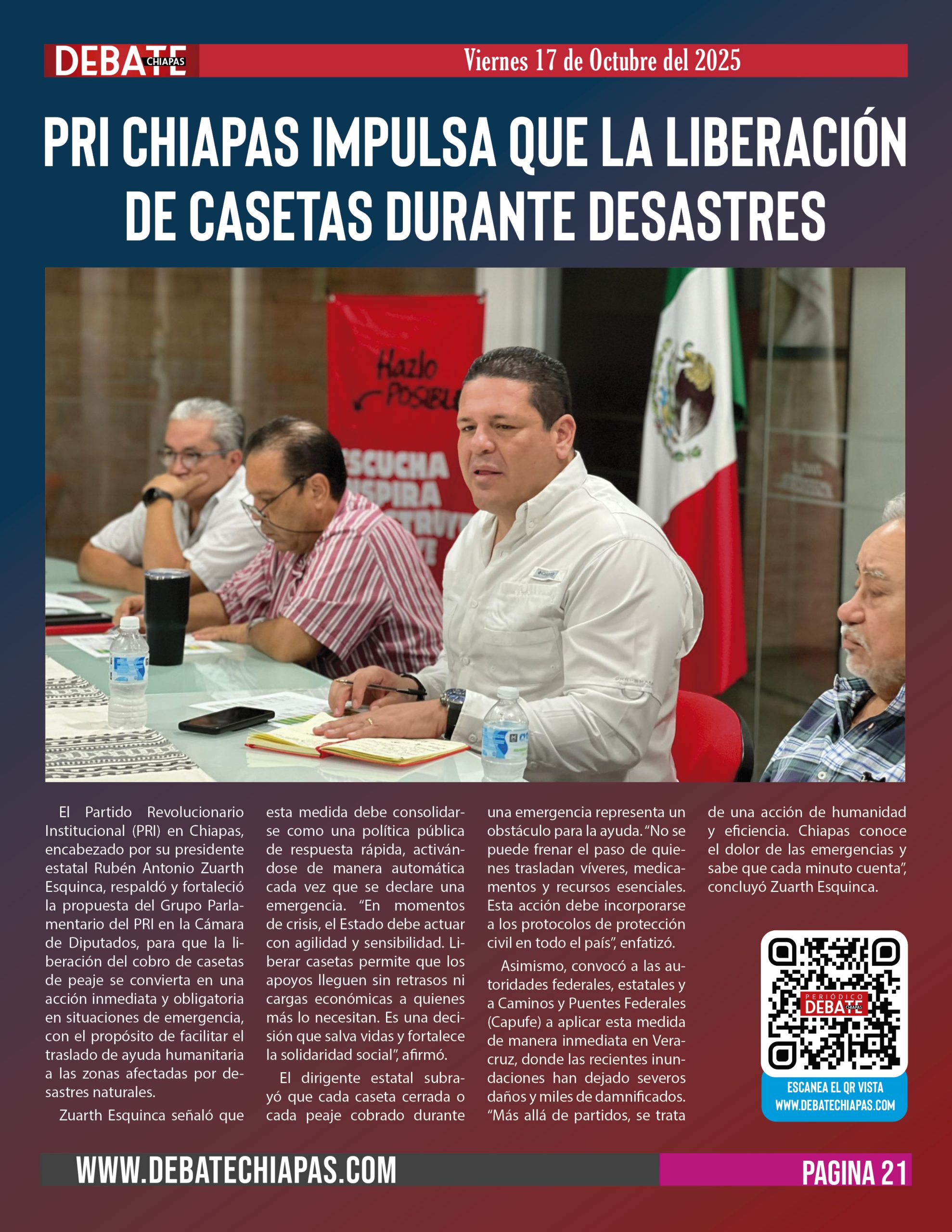 El Partido Revolucionario Institucional (PRI) en Chiapas, encabezado por su presidente estatal Rubén Antonio Zuarth Esquinca, respaldó y fortaleció la propuesta del Grupo Parlamentario del PRI en la Cámara de Diputados, para que la liberación del cobro de casetas de peaje se convierta en una acción inmediata y obligatoria en situaciones de emergencia, con el propósito de facilitar el traslado de ayuda humanitaria a las zonas afectadas por desastres naturales.