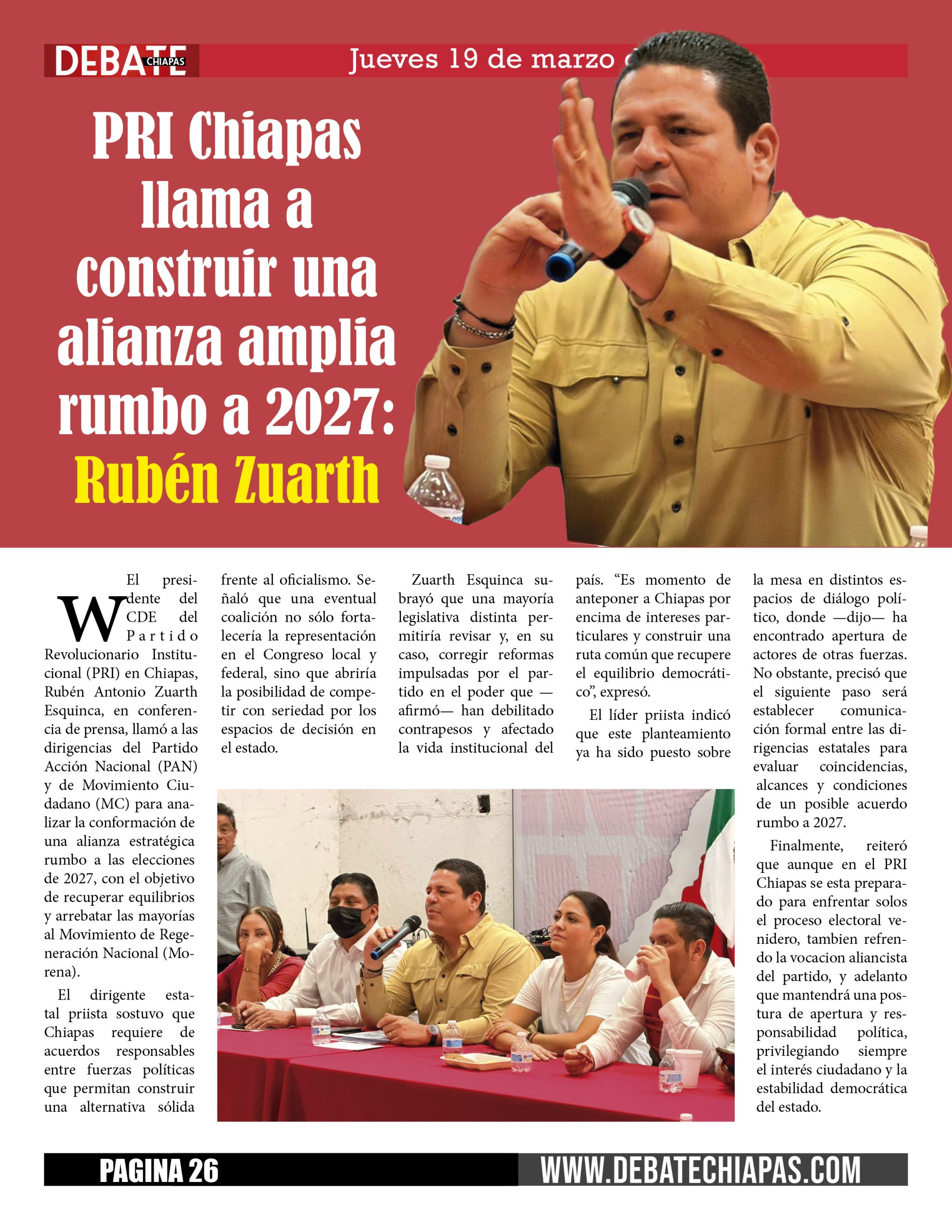 El presidente del CDE del Partido Revolucionario Institucional (PRI) en Chiapas, Rubén Antonio Zuarth Esquinca, en conferencia de prensa, llamó a las dirigencias del Partido Acción Nacional (PAN) y de Movimiento Ciudadano (MC) para analizar la conformación de una alianza estratégica rumbo a las elecciones de 2027, con el objetivo de recuperar equilibrios y arrebatar las mayorías al Movimiento de Regeneración Nacional (Morena).