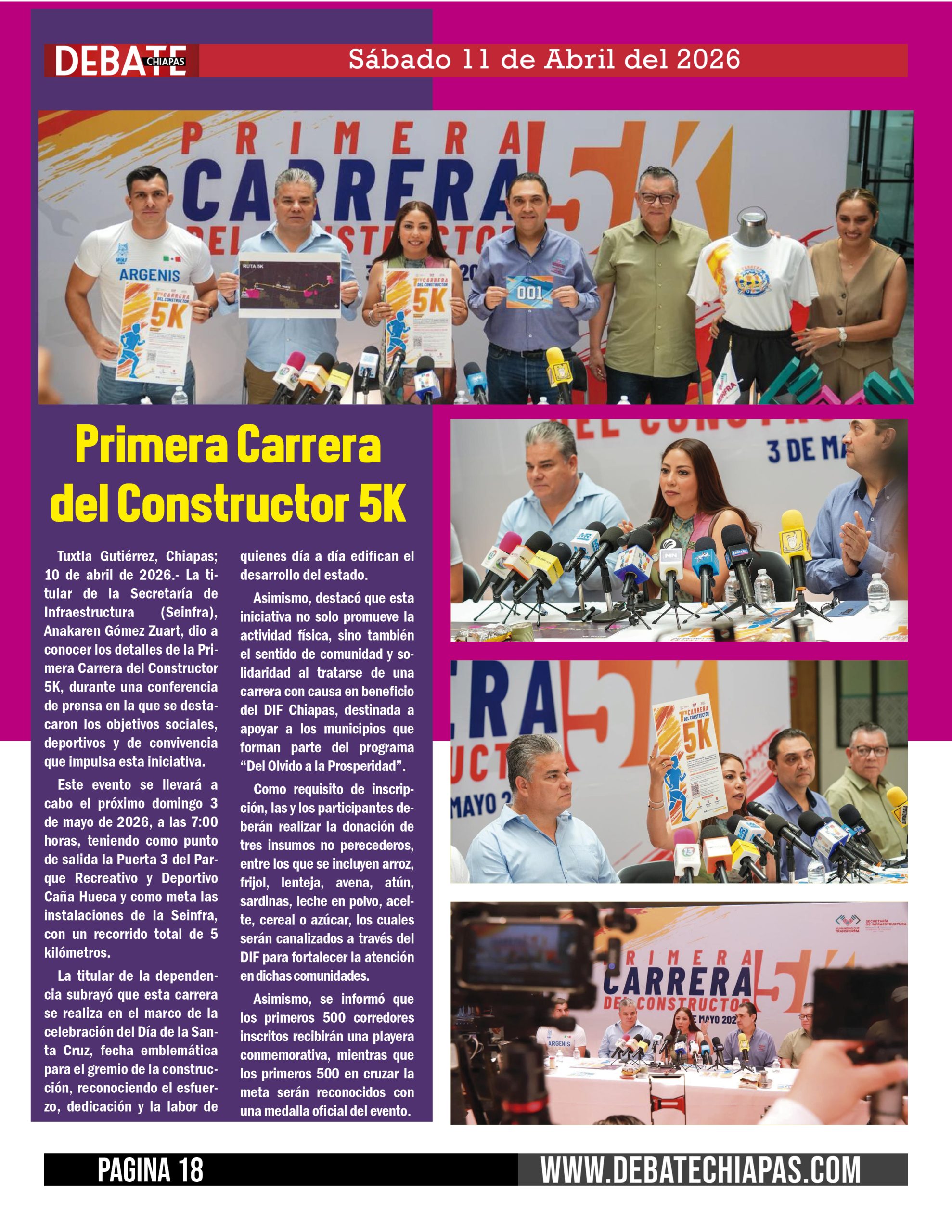 Tuxtla Gutiérrez, Chiapas; 10 de abril de 2026.- La titular de la Secretaría de Infraestructura (Seinfra), Anakaren Gómez Zuart, dio a conocer los detalles de la Primera Carrera del Constructor 5K, durante una conferencia de prensa en la que se destacaron los objetivos sociales, deportivos y de convivencia que impulsa esta iniciativa.