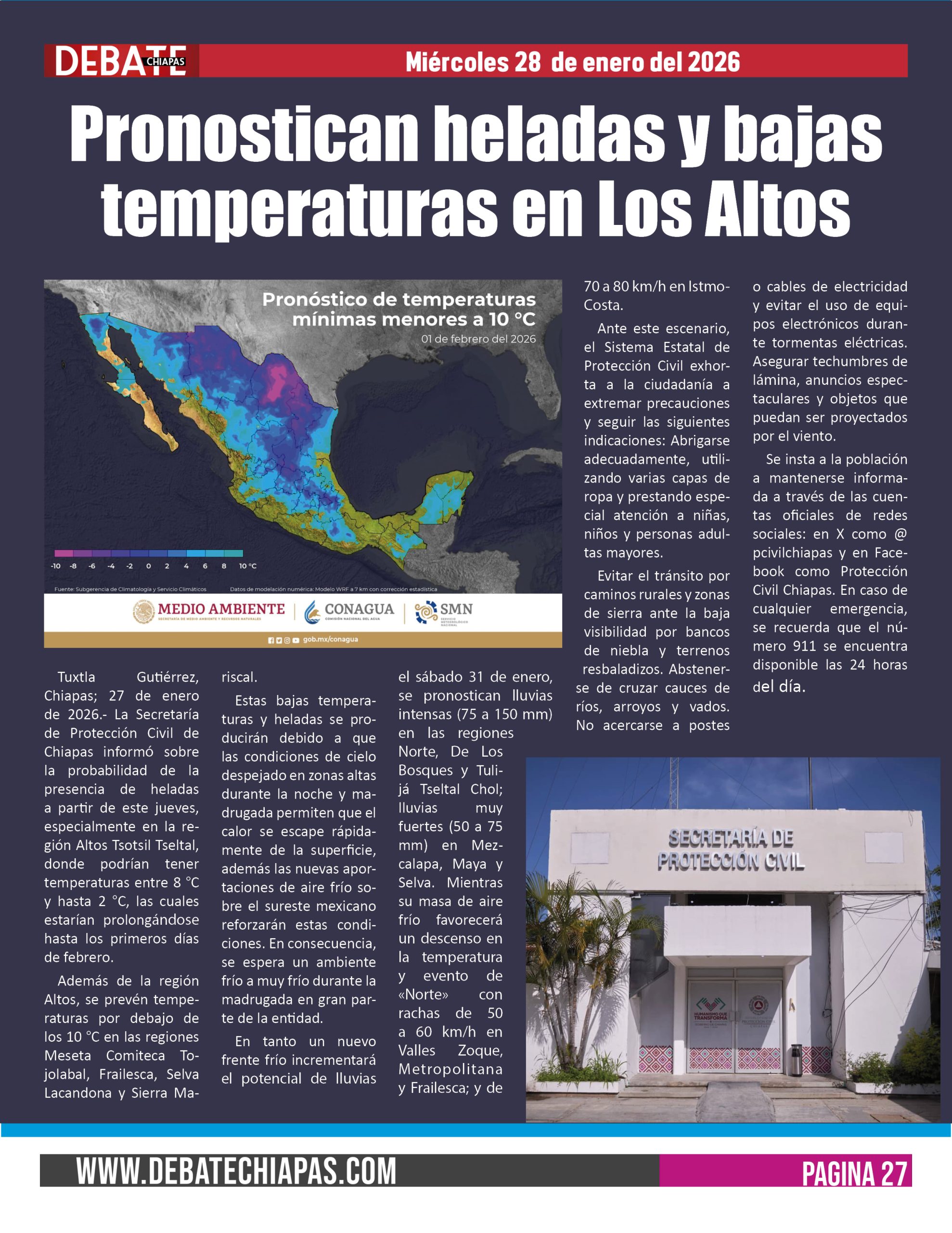 Tuxtla Gutiérrez, Chiapas; 27 de enero de 2026.- La Secretaría de Protección Civil de Chiapas informó sobre la probabilidad de la presencia de heladas a partir de este jueves, especialmente en la región Altos Tsotsil Tseltal, donde podrían tener temperaturas entre 8 °C y hasta 2 °C, las cuales estarían prolongándose hasta los primeros días de febrero.