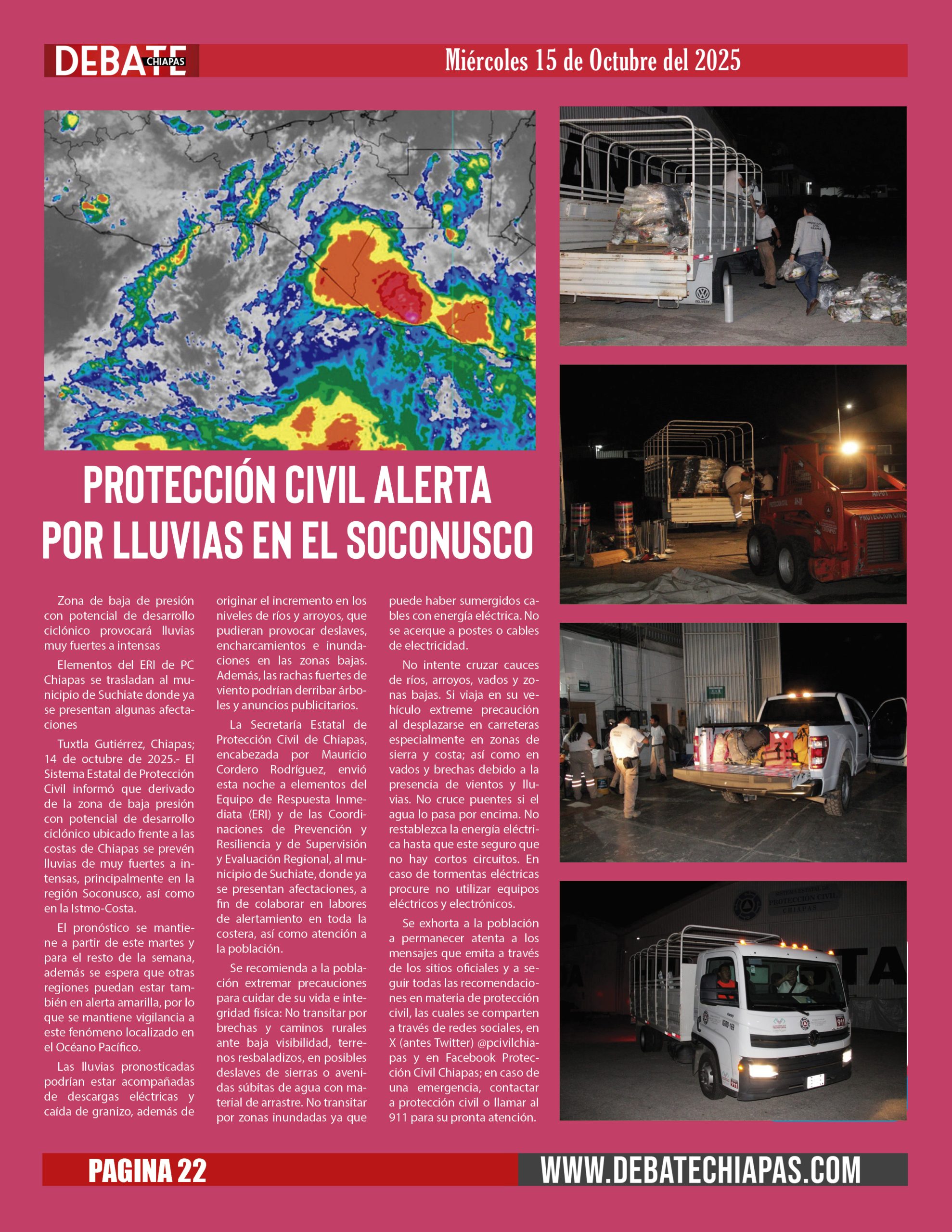 Tuxtla Gutiérrez, Chiapas; 14 de octubre de 2025.- El Sistema Estatal de Protección Civil informó que derivado de la zona de baja presión con potencial de desarrollo ciclónico ubicado frente a las costas de Chiapas se prevén lluvias de muy fuertes a intensas, principalmente en la región Soconusco, así como en la Istmo-Costa.