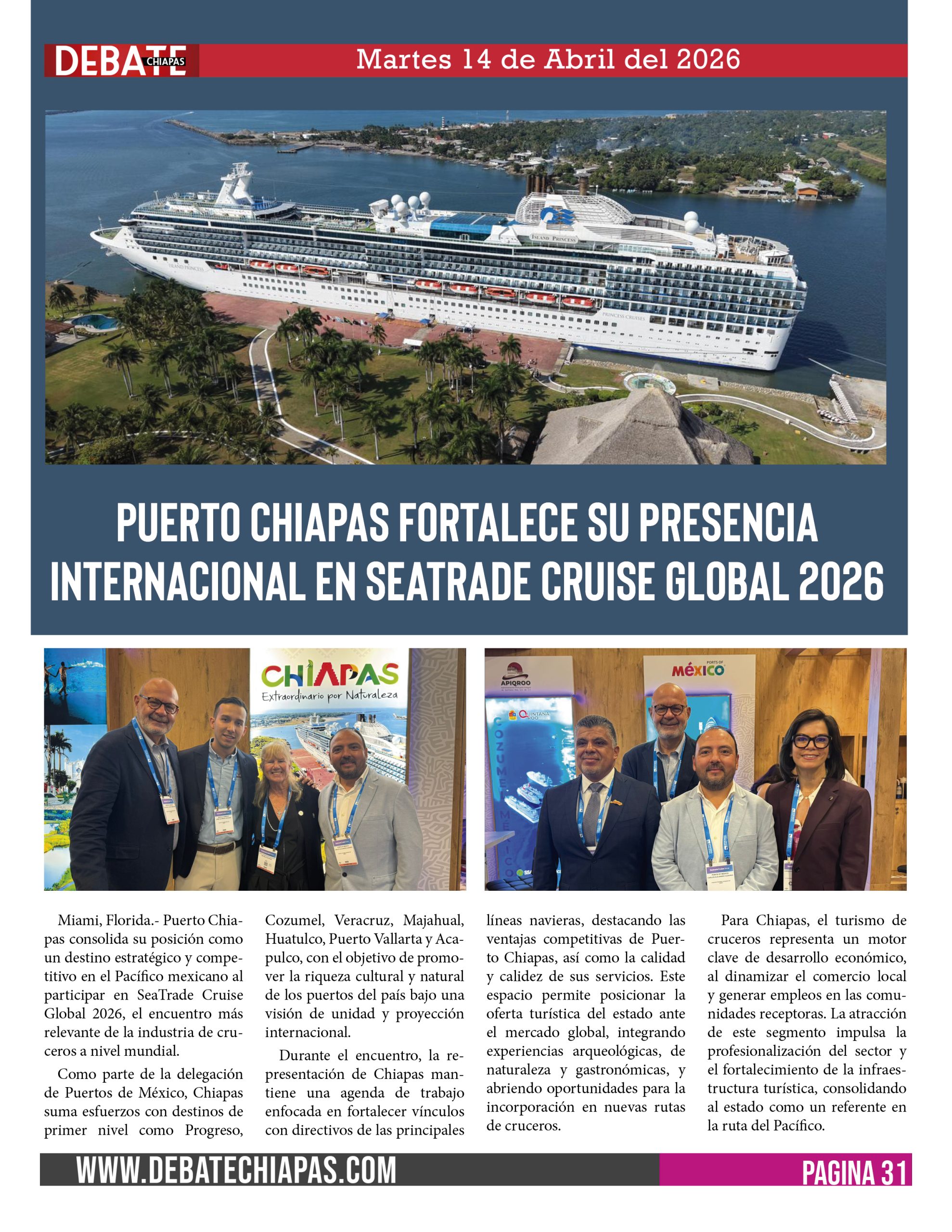 Como parte de la delegación de Puertos de México, Chiapas suma esfuerzos con destinos de primer nivel como Progreso, Cozumel, Veracruz, Majahual, Huatulco, Puerto Vallarta y Acapulco, con el objetivo de promover la riqueza cultural y natural de los puertos del país bajo una visión de unidad y proyección internacional.