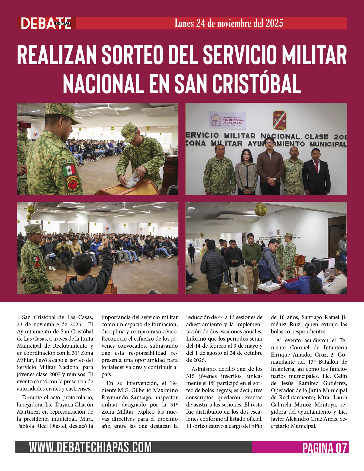 San Cristóbal de Las Casas, 23 de noviembre de 2025.– El Ayuntamiento de San Cristóbal de Las Casas, a través de la Junta Municipal de Reclutamiento y en coordinación con la 31ª Zona Militar, llevó a cabo el sorteo del Servicio Militar Nacional para jóvenes clase 2007 y remisos. El evento contó con la presencia de autoridades civiles y castrenses.