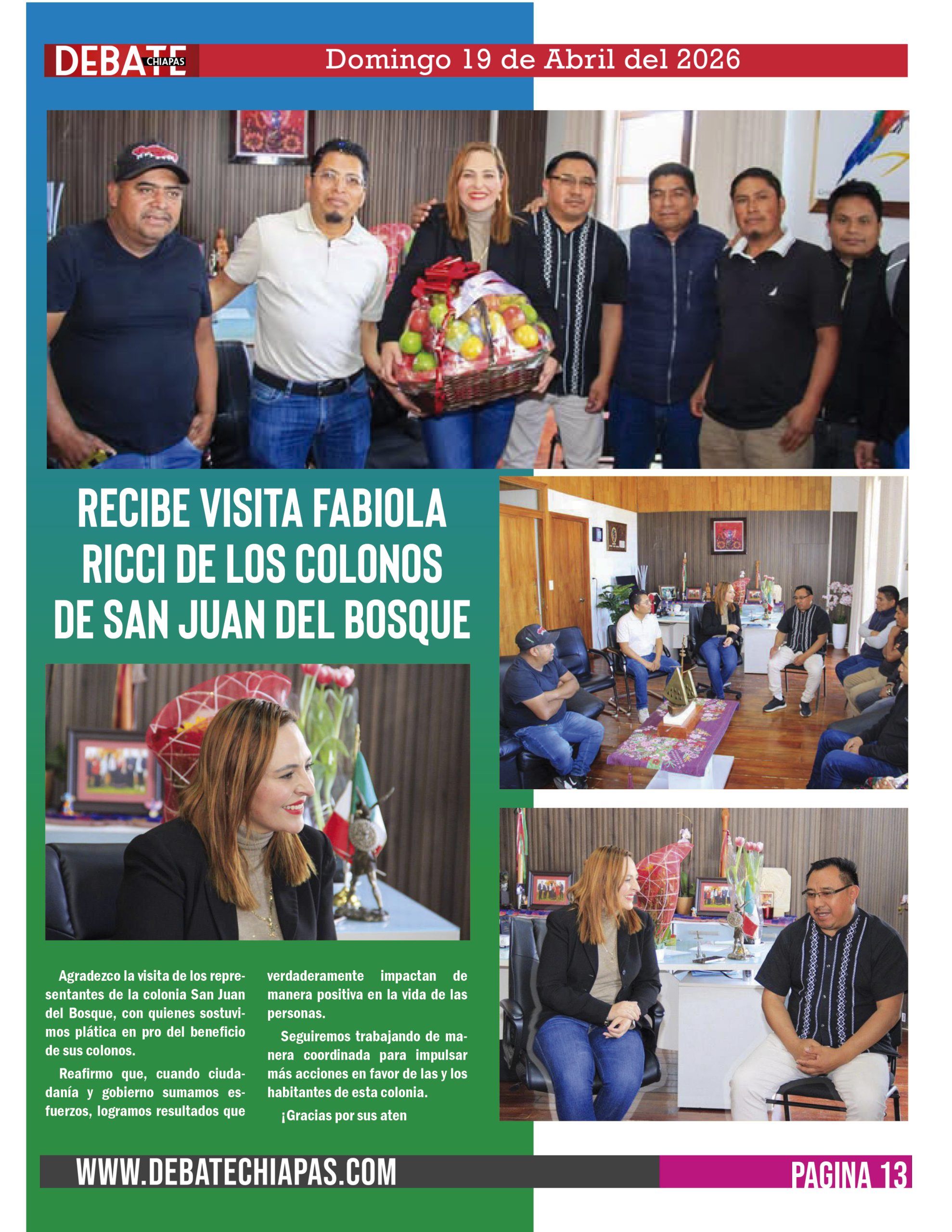 Agradezco la visita de los representantes de la colonia San Juan del Bosque, con quienes sostuvimos plática en pro del beneficio de sus colonos.