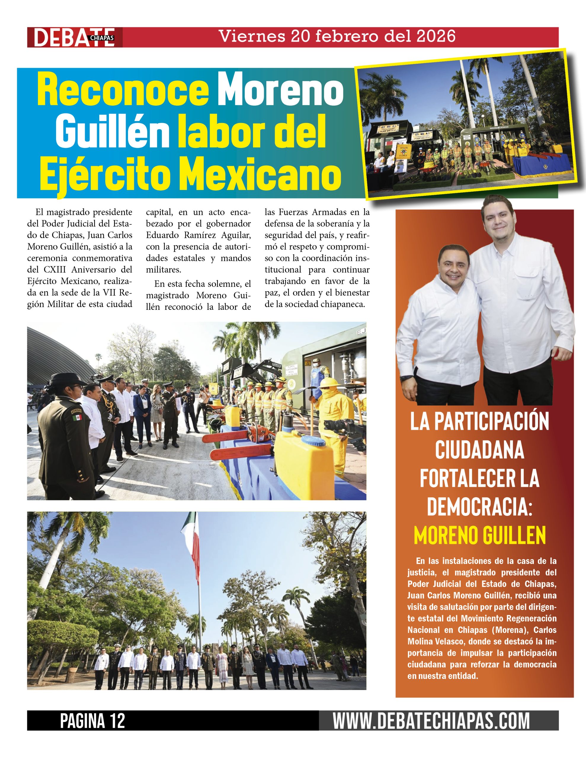 El magistrado presidente del Poder Judicial del Estado de Chiapas, Juan Carlos Moreno Guillén, asistió a la ceremonia conmemorativa del CXIII Aniversario del Ejército Mexicano, realizada en la sede de la VII Región Militar de esta ciudad capital, en un acto encabezado por el gobernador Eduardo Ramírez Aguilar, con la presencia de autoridades estatales y mandos militares.