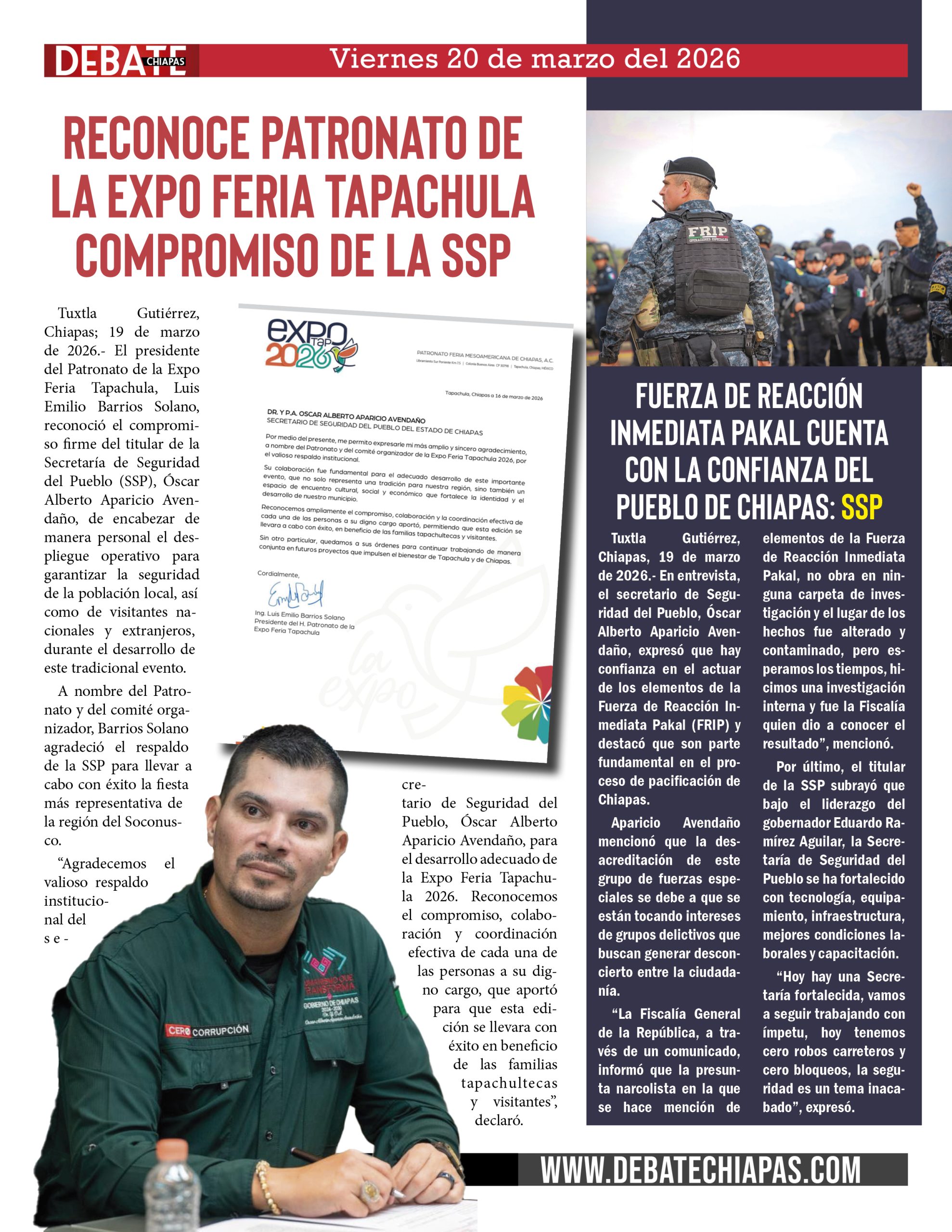 Tuxtla Gutiérrez, Chiapas; 19 de marzo de 2026.- El presidente del Patronato de la Expo Feria Tapachula, Luis Emilio Barrios Solano, reconoció el compromiso firme del titular de la Secretaría de Seguridad del Pueblo (SSP), Óscar Alberto Aparicio Avendaño, de encabezar de manera personal el despliegue operativo para garantizar la seguridad de la población local, así como de visitantes nacionales y extranjeros, durante el desarrollo de este tradicional evento.