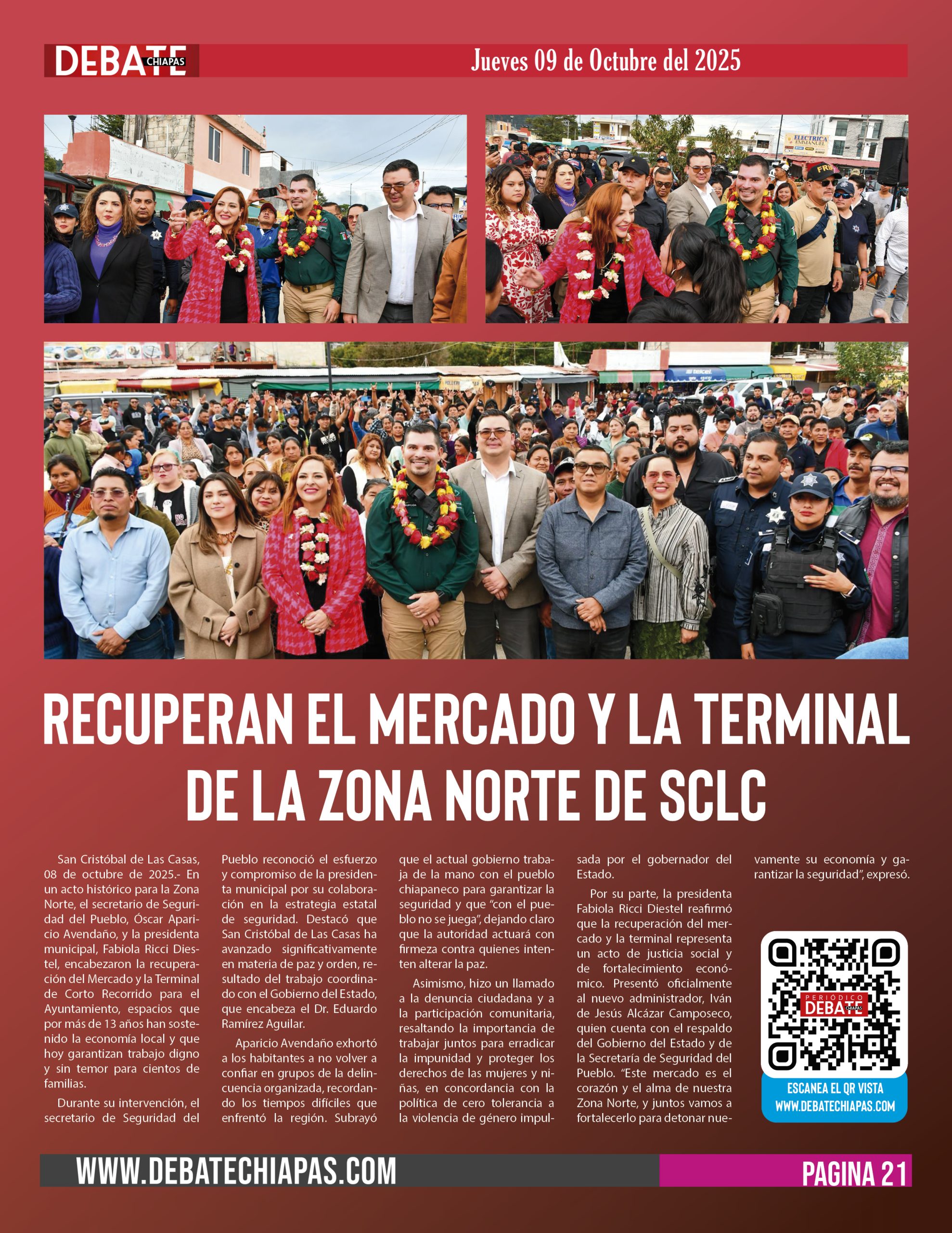 Por su parte, la presidenta Fabiola Ricci Diestel reafirmó que la recuperación del mercado y la terminal representa un acto de justicia social y de fortalecimiento económico. Presentó oficialmente al nuevo administrador, Iván de Jesús Alcázar Camposeco, quien cuenta con el respaldo del Gobierno del Estado y de la Secretaría de Seguridad del Pueblo. “Este mercado es el corazón y el alma de nuestra Zona Norte, y juntos vamos a fortalecerlo para detonar nuevamente su economía y garantizar la seguridad”, expresó.