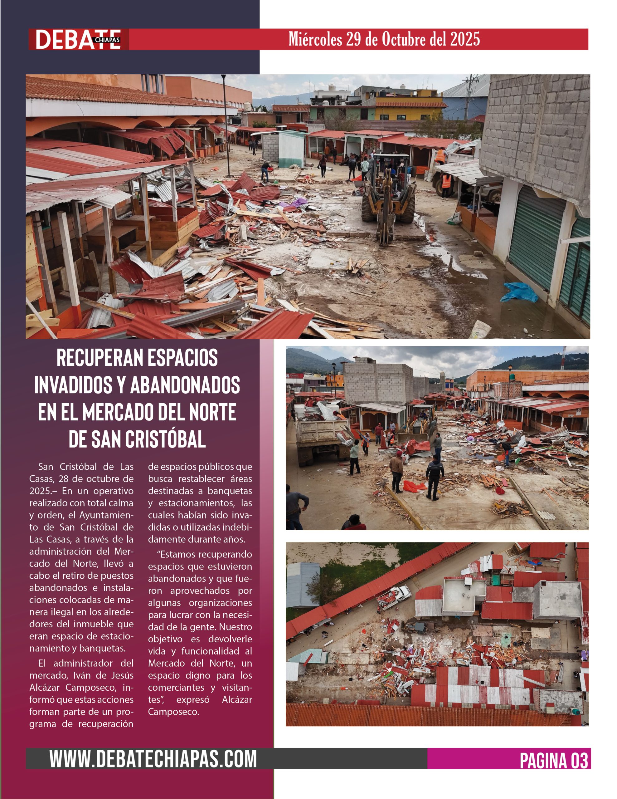 “Estamos recuperando espacios que estuvieron abandonados y que fueron aprovechados por algunas organizaciones para lucrar con la necesidad de la gente. Nuestro objetivo es devolverle vida y funcionalidad al Mercado del Norte, un espacio digno para los comerciantes y visitantes”, expresó Alcázar Camposeco.