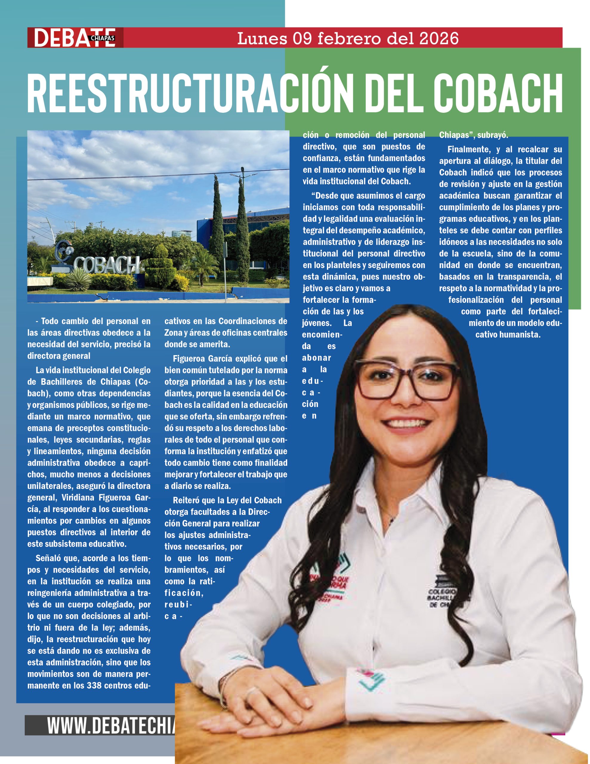 La vida institucional del Colegio de Bachilleres de Chiapas (Cobach), como otras dependencias y organismos públicos, se rige mediante un marco normativo, que emana de preceptos constitucionales, leyes secundarias, reglas y lineamientos, ninguna decisión administrativa obedece a caprichos, mucho menos a decisiones unilaterales, aseguró la directora general, Viridiana Figueroa García, al responder a los cuestionamientos por cambios en algunos puestos directivos al interior de este subsistema educativo.
