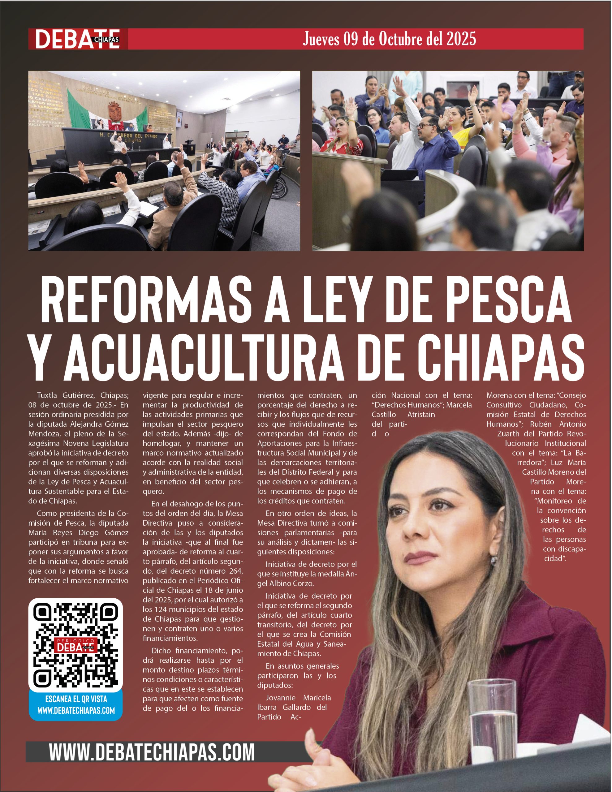 Tuxtla Gutiérrez, Chiapas; 08 de octubre de 2025.- En sesión ordinaria presidida por la diputada Alejandra Gómez Mendoza, el pleno de la Sexagésima Novena Legislatura aprobó la iniciativa de decreto por el que se reforman y adicionan diversas disposiciones de la Ley de Pesca y Acuacultura Sustentable para el Estado de Chiapas.