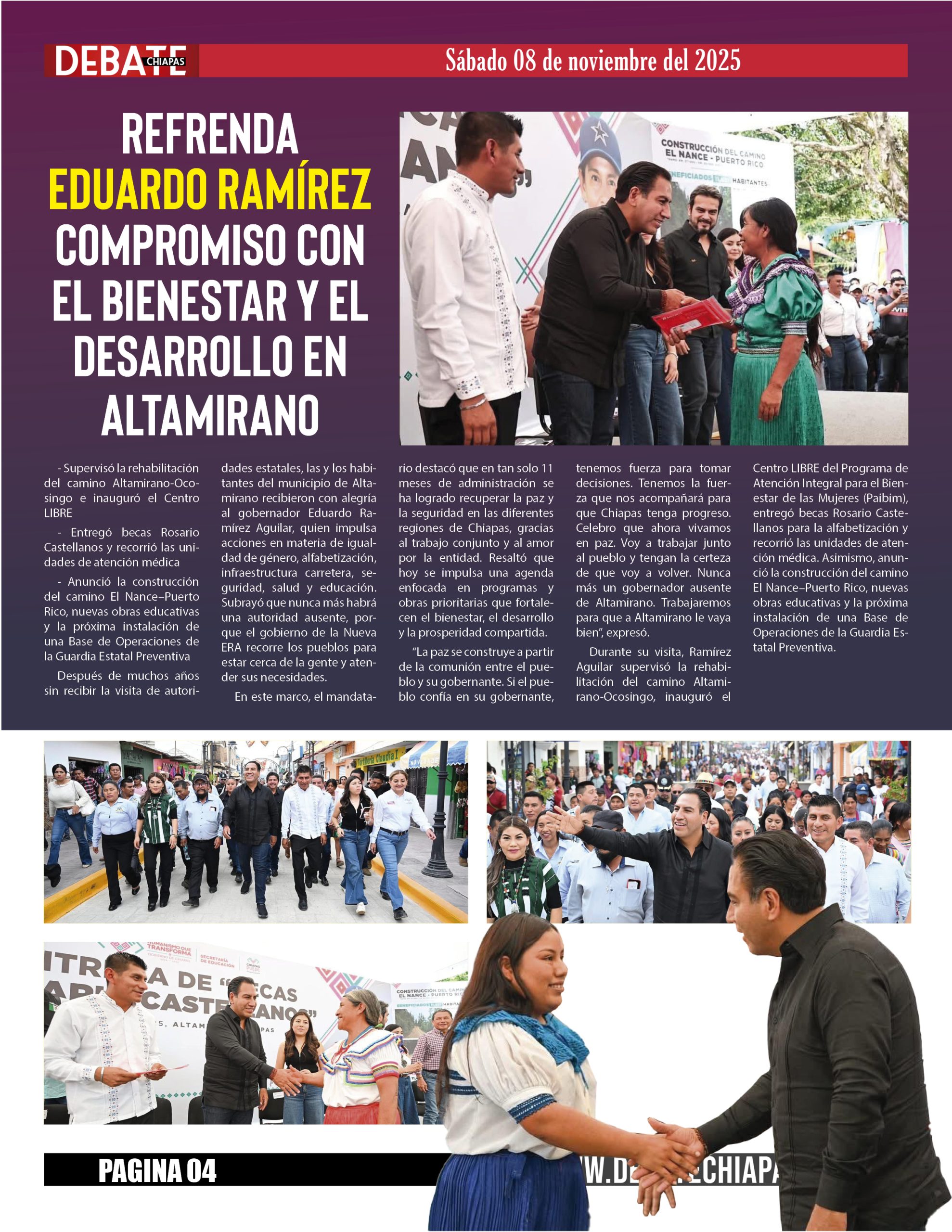 Durante su visita, Ramírez Aguilar supervisó la rehabilitación del camino Altamirano-Ocosingo, inauguró el Centro LIBRE del Programa de Atención Integral para el Bienestar de las Mujeres (Paibim), entregó becas Rosario Castellanos para la alfabetización y recorrió las unidades de atención médica. Asimismo, anunció la construcción del camino El Nance–Puerto Rico, nuevas obras educativas y la próxima instalación de una Base de Operaciones de la Guardia Estatal Preventiva.