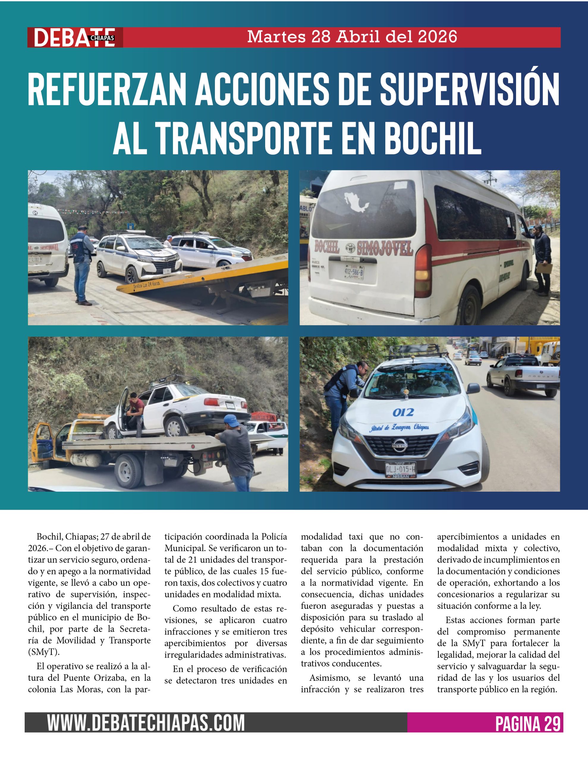 Bochil, Chiapas; 27 de abril de 2026.– Con el objetivo de garantizar un servicio seguro, ordenado y en apego a la normatividad vigente, se llevó a cabo un operativo de supervisión, inspección y vigilancia del transporte público en el municipio de Bochil, por parte de la Secretaría de Movilidad y Transporte (SMyT).