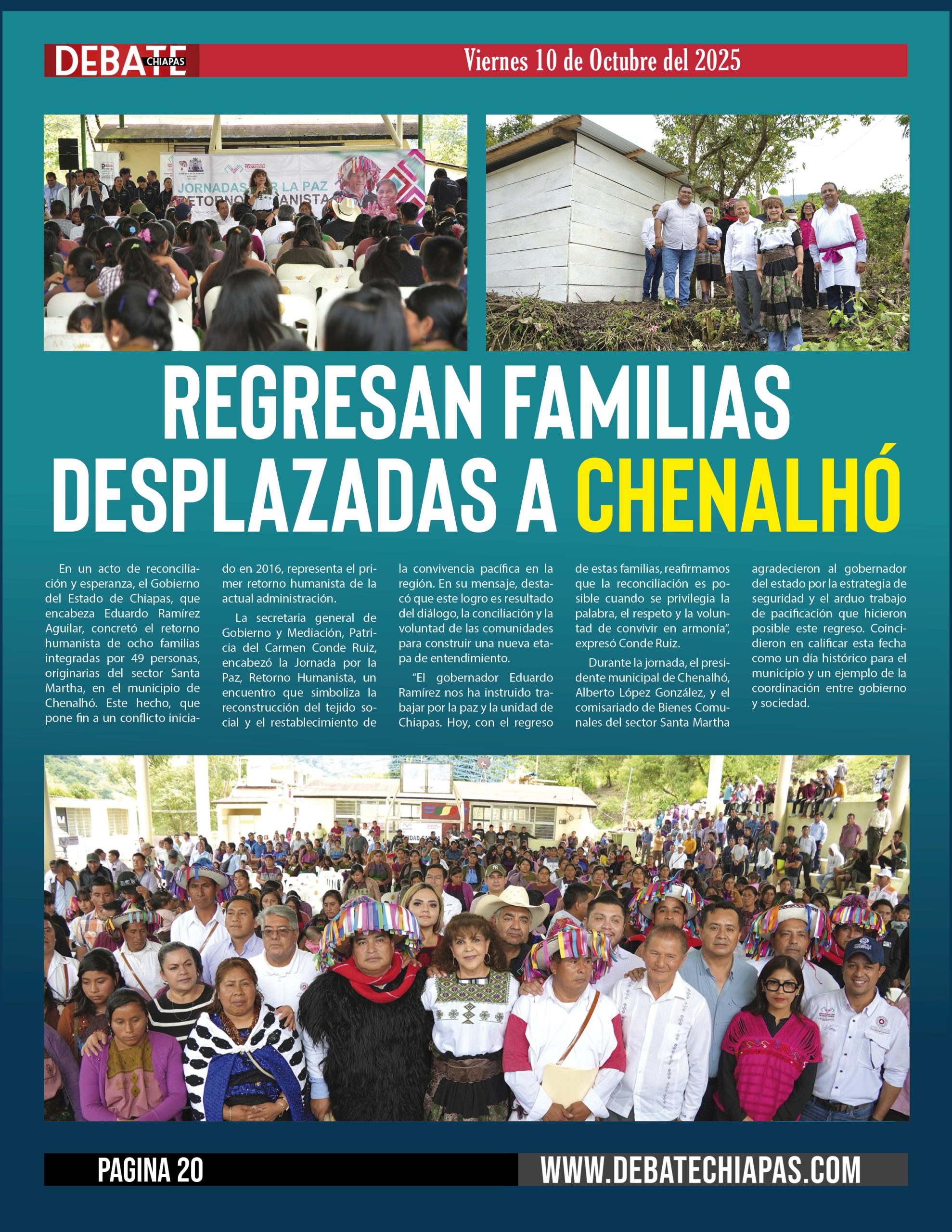 En un acto de reconciliación y esperanza, el Gobierno del Estado de Chiapas, que encabeza Eduardo Ramírez Aguilar, concretó el retorno humanista de ocho familias integradas por 49 personas, originarias del sector Santa Martha, en el municipio de Chenalhó. Este hecho, que pone fin a un conflicto iniciado en 2016, representa el primer retorno humanista de la actual administración.