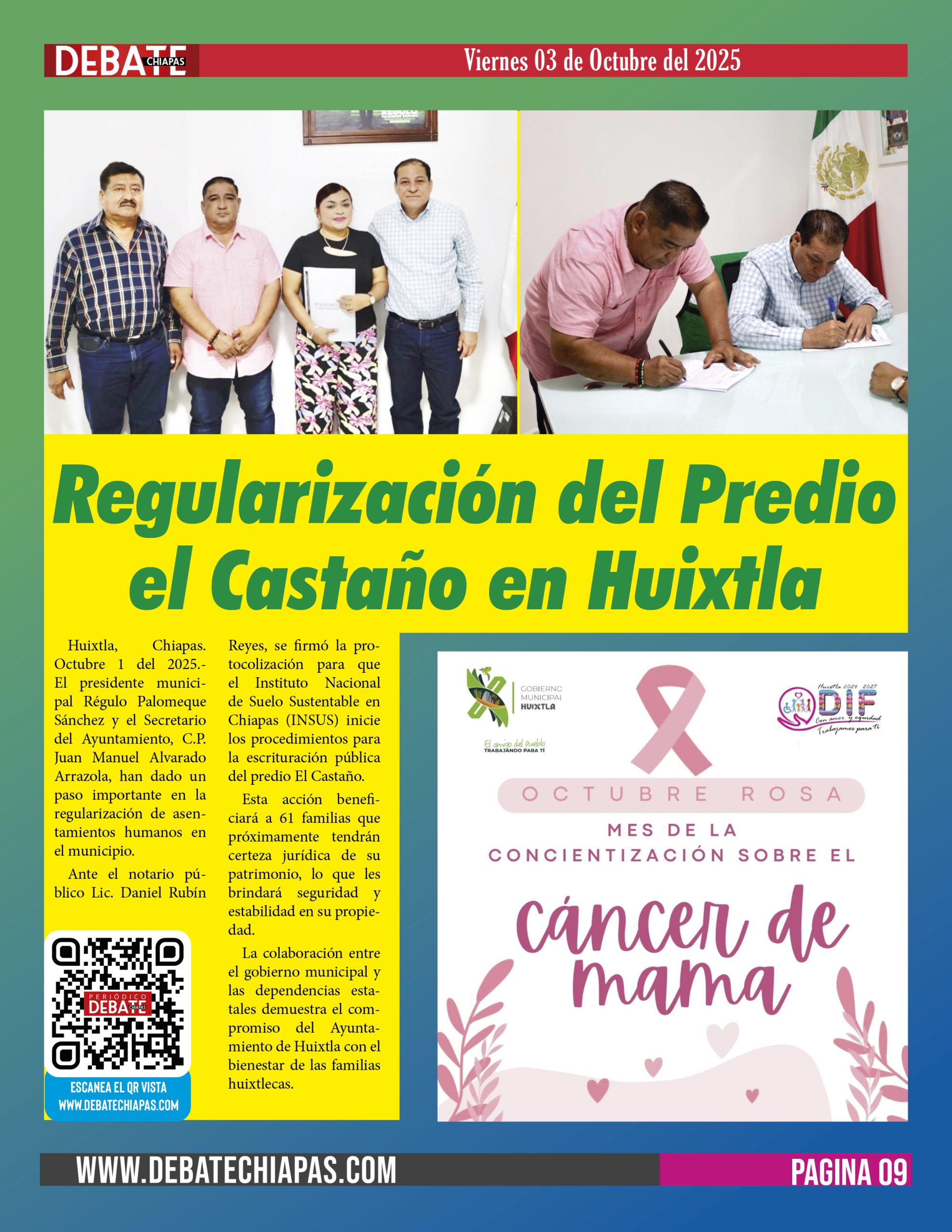 Huixtla, Chiapas. Octubre 1 del 2025.- El presidente municipal Régulo Palomeque Sánchez y el Secretario del Ayuntamiento, C.P. Juan Manuel Alvarado Arrazola, han dado un paso importante en la regularización de asentamientos humanos en el municipio.