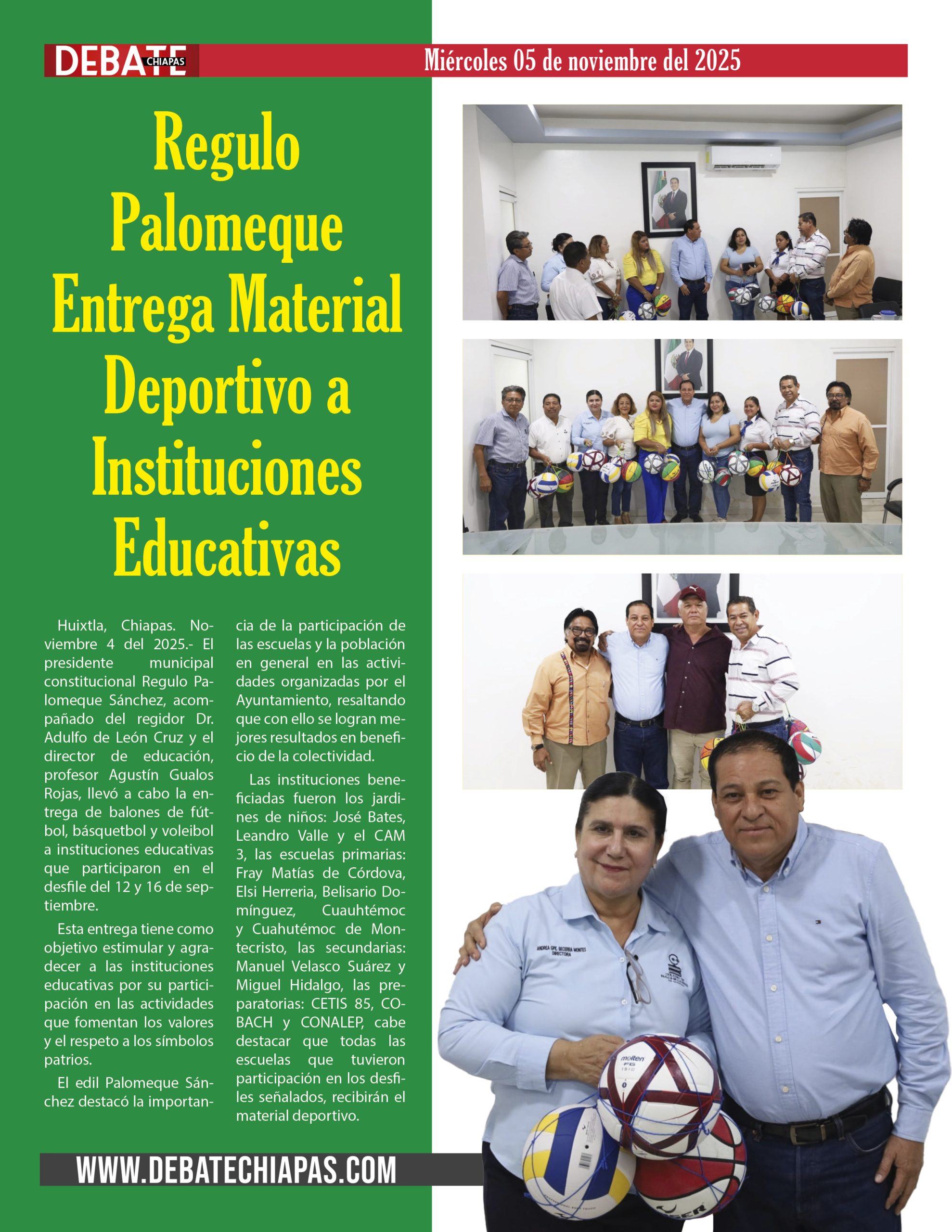 Huixtla, Chiapas. Noviembre 4 del 2025.- El presidente municipal constitucional Regulo Palomeque Sánchez, acompañado del regidor Dr. Adulfo de León Cruz y el director de educación, profesor Agustín Gualos Rojas, llevó a cabo la entrega de balones de fútbol, básquetbol y voleibol a instituciones educativas que participaron en el desfile del 12 y 16 de septiembre.