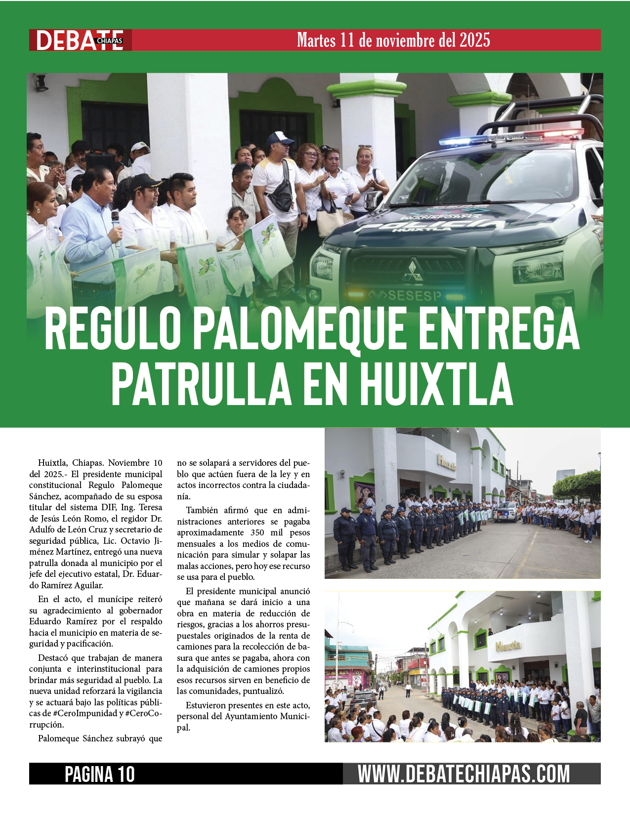 Huixtla, Chiapas. Noviembre 10 del 2025.- El presidente municipal constitucional Regulo Palomeque Sánchez, acompañado de su esposa titular del sistema DIF, Ing. Teresa de Jesús León Romo, el regidor Dr. Adulfo de León Cruz y secretario de seguridad pública, Lic. Octavio Jiménez Martínez, entregó una nueva patrulla donada al municipio por el jefe del ejecutivo estatal, Dr. Eduardo Ramírez Aguilar.