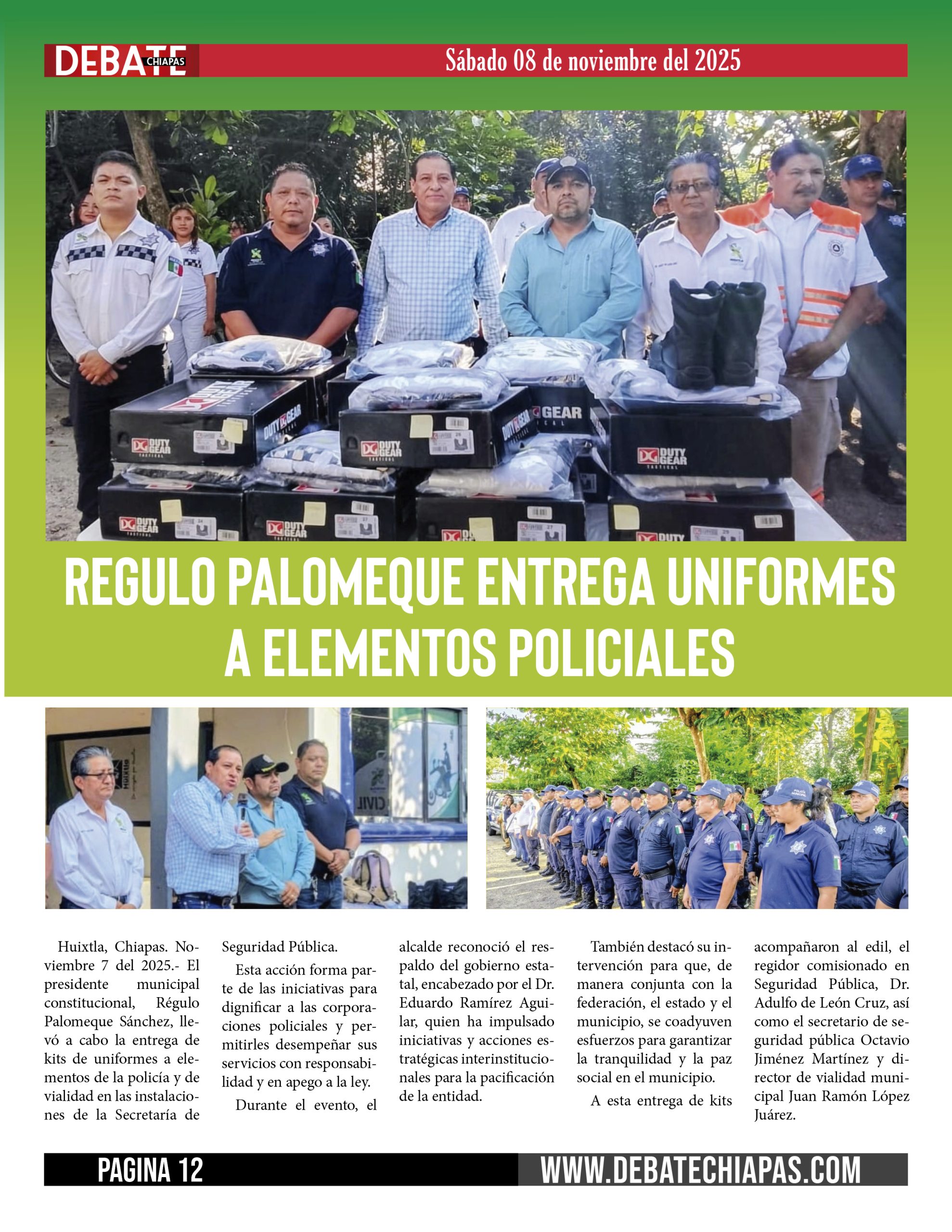 Huixtla, Chiapas. Noviembre 7 del 2025.- El presidente municipal constitucional, Régulo Palomeque Sánchez, llevó a cabo la entrega de kits de uniformes a elementos de la policía y de vialidad en las instalaciones de la Secretaría de Seguridad Pública.