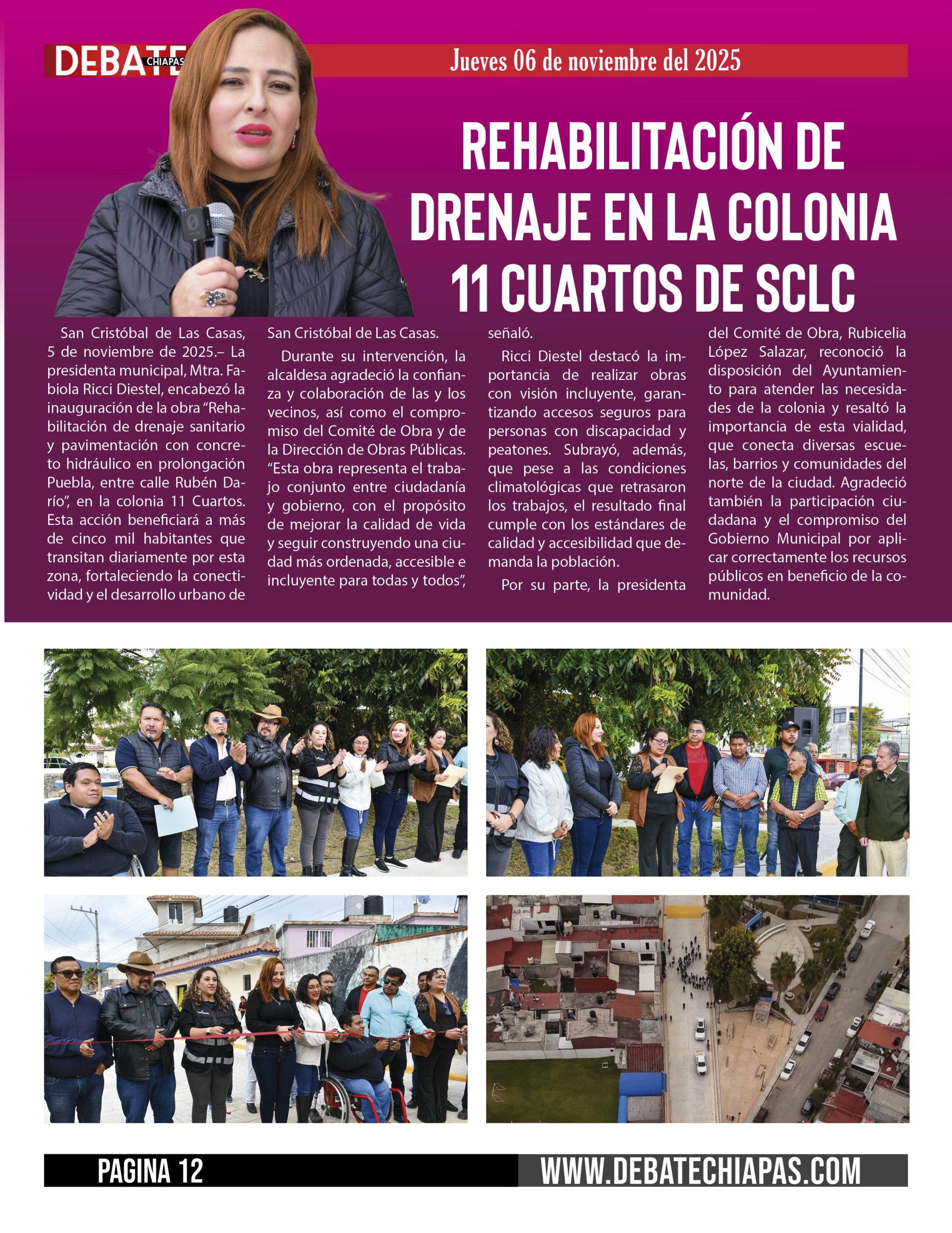 San Cristóbal de Las Casas, 5 de noviembre de 2025.– La presidenta municipal, Mtra. Fabiola Ricci Diestel, encabezó la inauguración de la obra “Rehabilitación de drenaje sanitario y pavimentación con concreto hidráulico en prolongación Puebla, entre calle Rubén Darío”, en la colonia 11 Cuartos. Esta acción beneficiará a más de cinco mil habitantes que transitan diariamente por esta zona, fortaleciendo la conectividad y el desarrollo urbano de San Cristóbal de Las Casas.