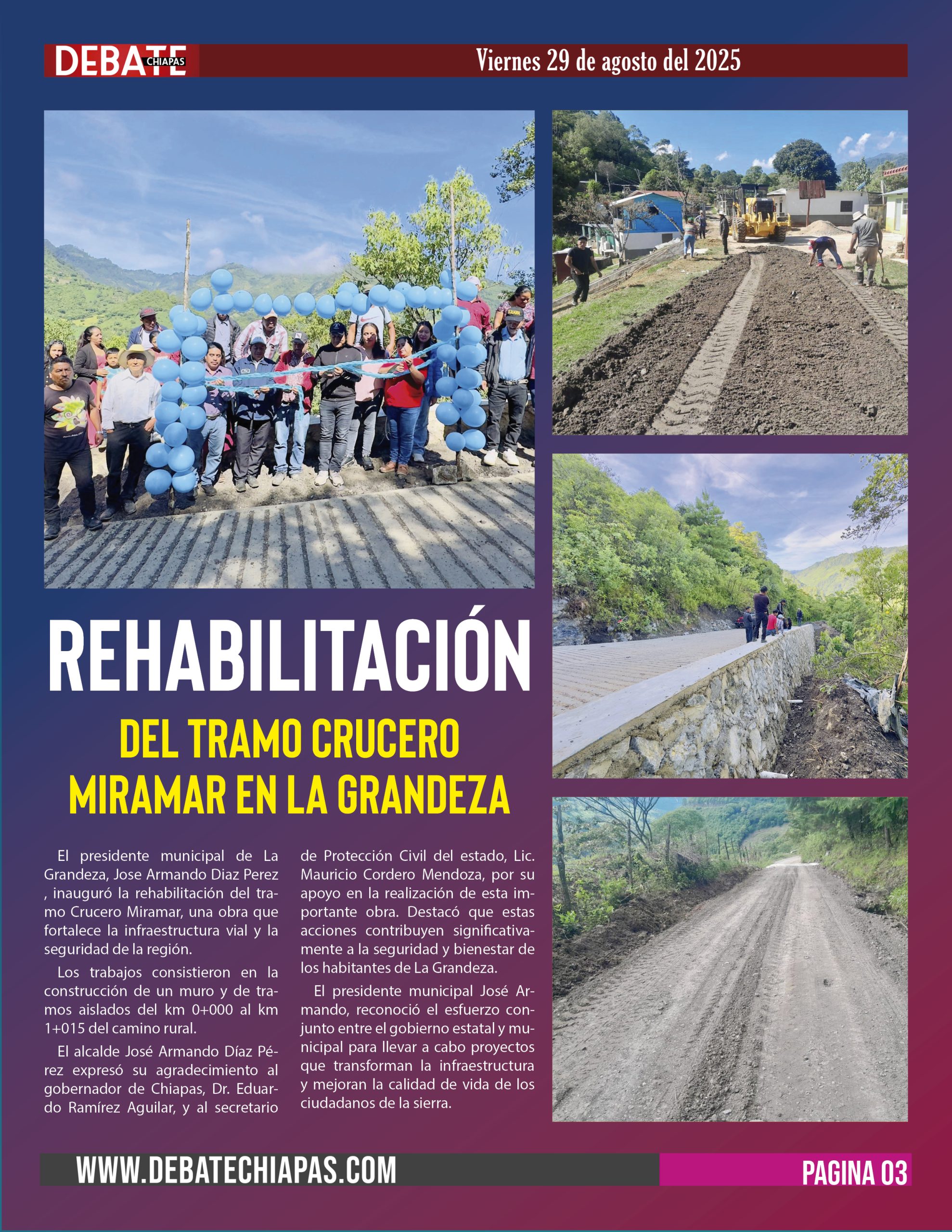 El presidente municipal de La Grandeza, Jose Armando Diaz Perez , inauguró la rehabilitación del tramo Crucero Miramar, una obra que fortalece la infraestructura vial y la seguridad de la región.