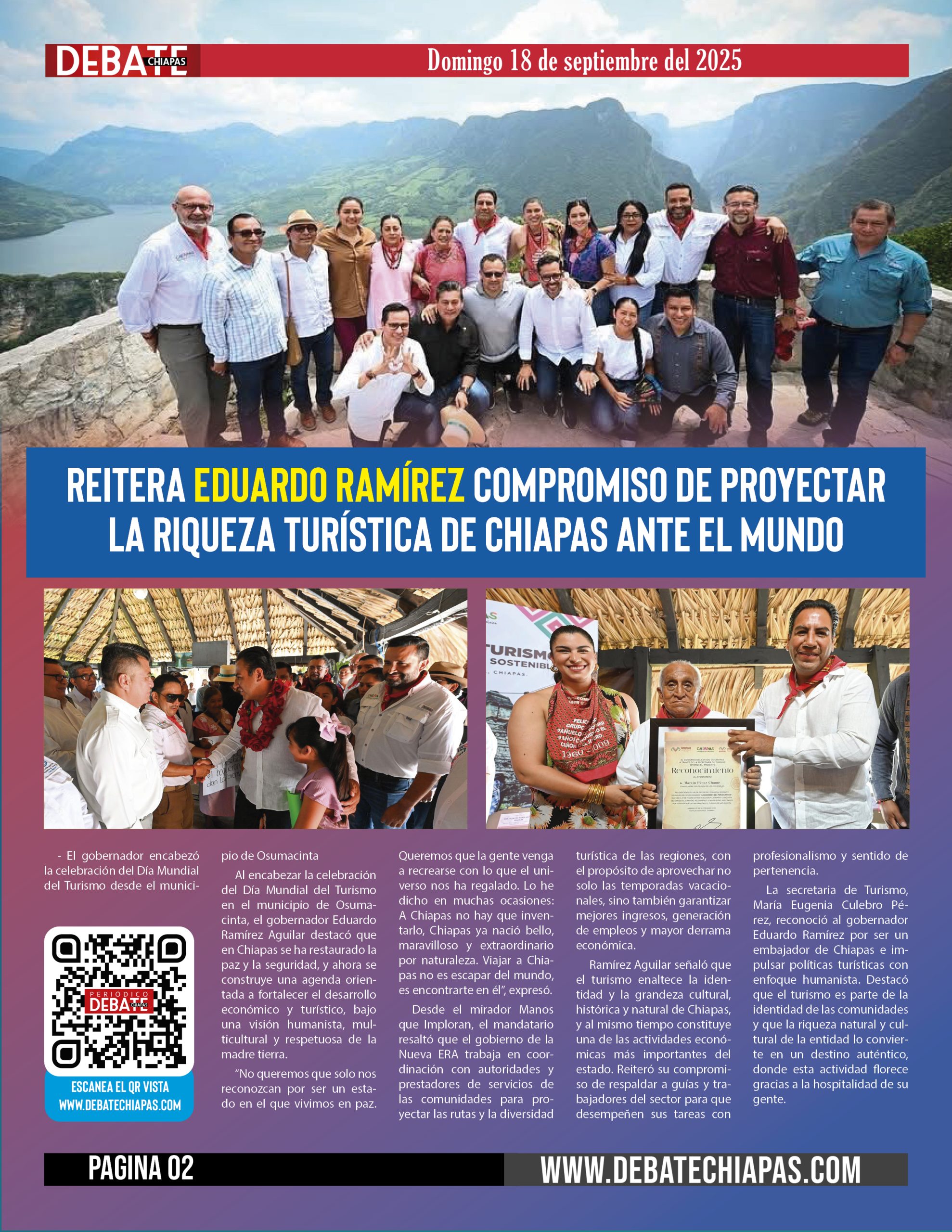 Al encabezar la celebración del Día Mundial del Turismo en el municipio de Osumacinta, el gobernador Eduardo Ramírez Aguilar destacó que en Chiapas se ha restaurado la paz y la seguridad, y ahora se construye una agenda orientada a fortalecer el desarrollo económico y turístico, bajo una visión humanista, multicultural y respetuosa de la madre tierra.