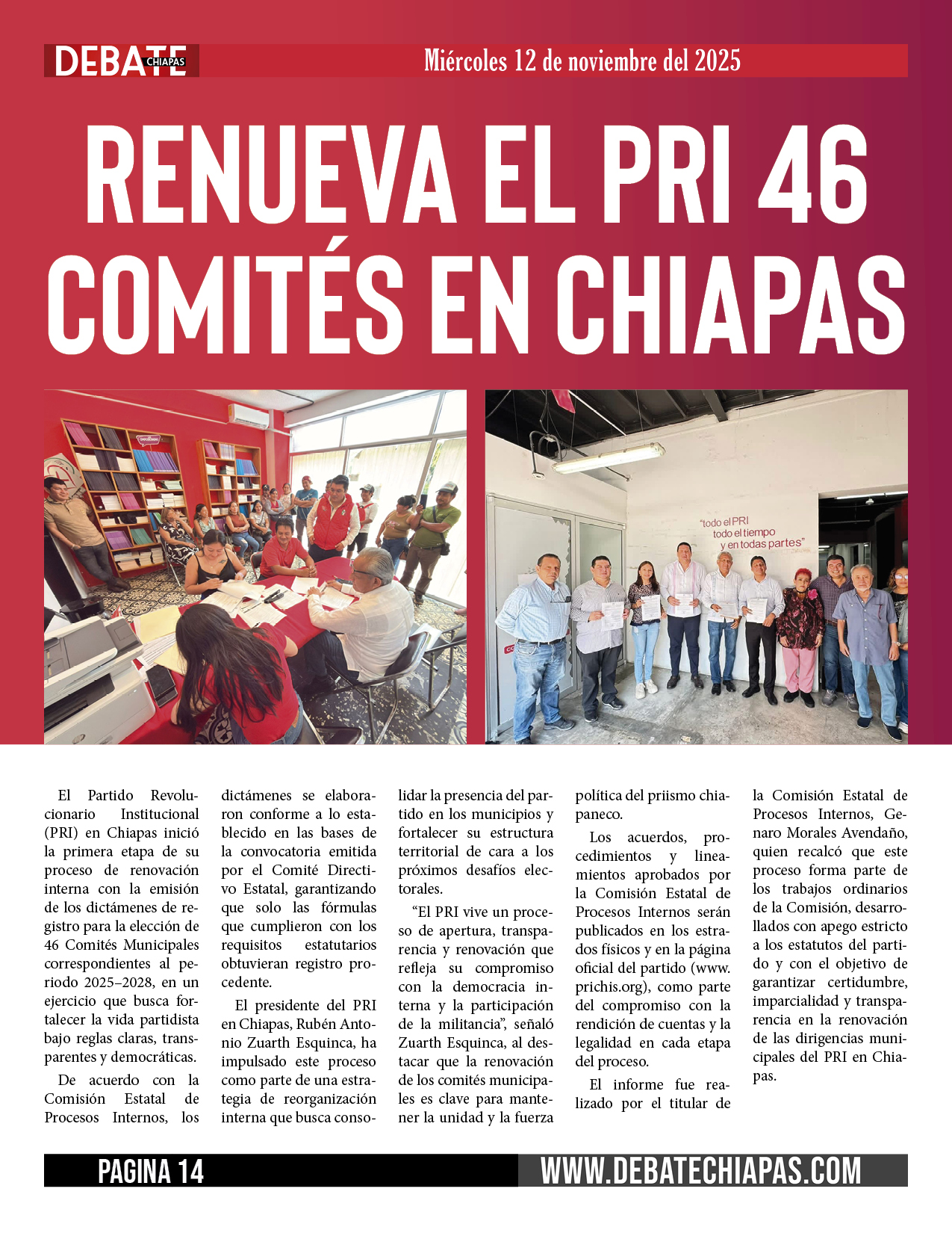 El Partido Revolucionario Institucional (PRI) en Chiapas inició la primera etapa de su proceso de renovación interna con la emisión de los dictámenes de registro para la elección de 46 Comités Municipales correspondientes al periodo 2025–2028, en un ejercicio que busca fortalecer la vida partidista bajo reglas claras, transparentes y democráticas.