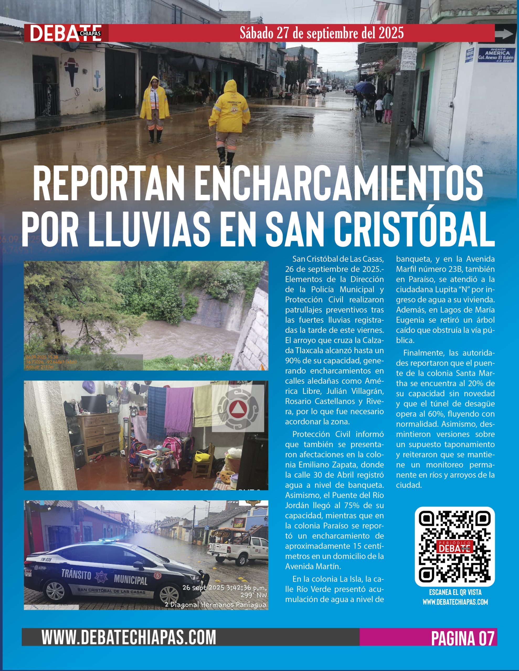 Protección Civil informó que también se presentaron afectaciones en la colonia Emiliano Zapata, donde la calle 30 de Abril registró agua a nivel de banqueta. Asimismo, el Puente del Río Jordán llegó al 75% de su capacidad, mientras que en la colonia Paraíso se reportó un encharcamiento de aproximadamente 15 centímetros en un domicilio de la Avenida Martín.