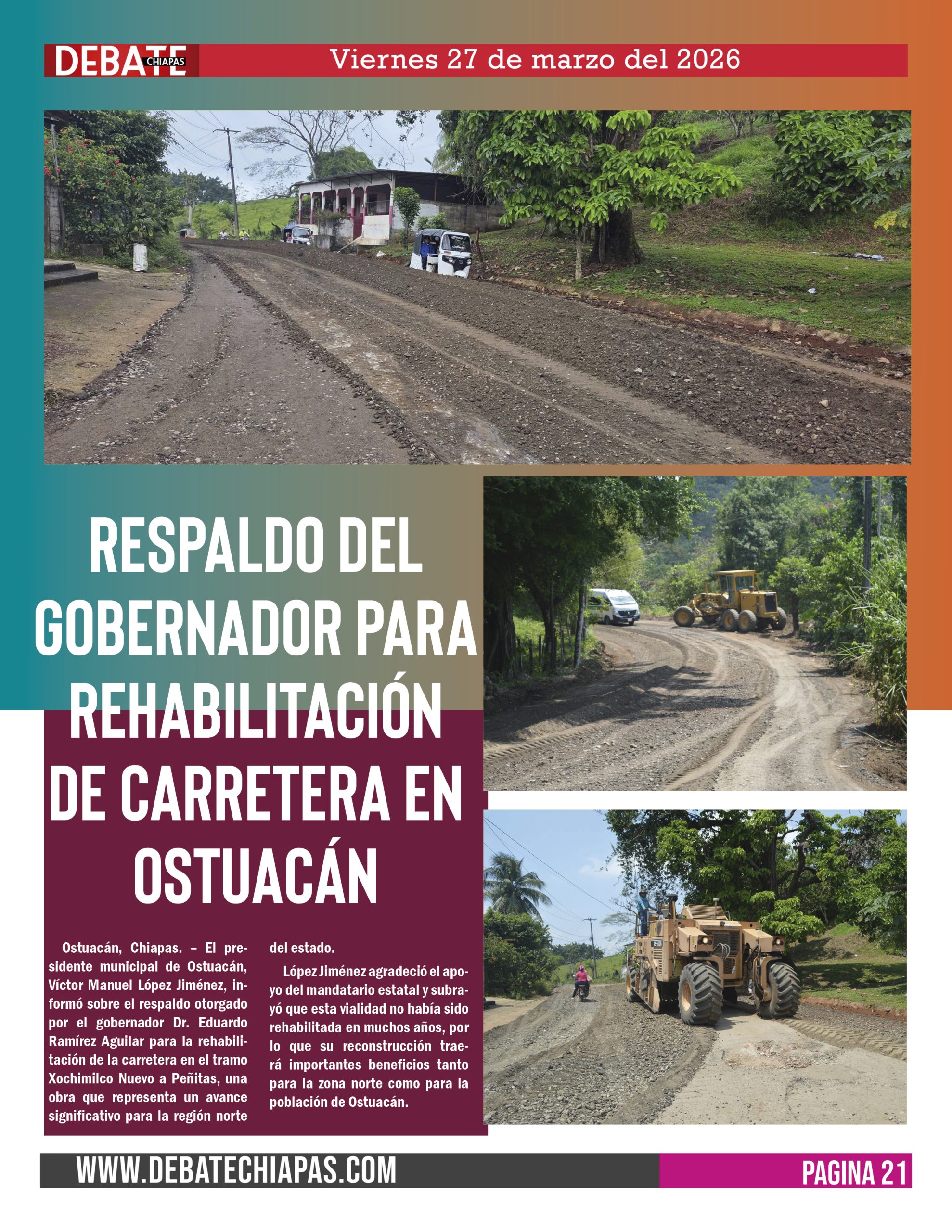 Ostuacán, Chiapas. – El presidente municipal de Ostuacán, Víctor Manuel López Jiménez, informó sobre el respaldo otorgado por el gobernador Dr. Eduardo Ramírez Aguilar para la rehabilitación de la carretera en el tramo Xochimilco Nuevo a Peñitas, una obra que representa un avance significativo para la región norte del estado.