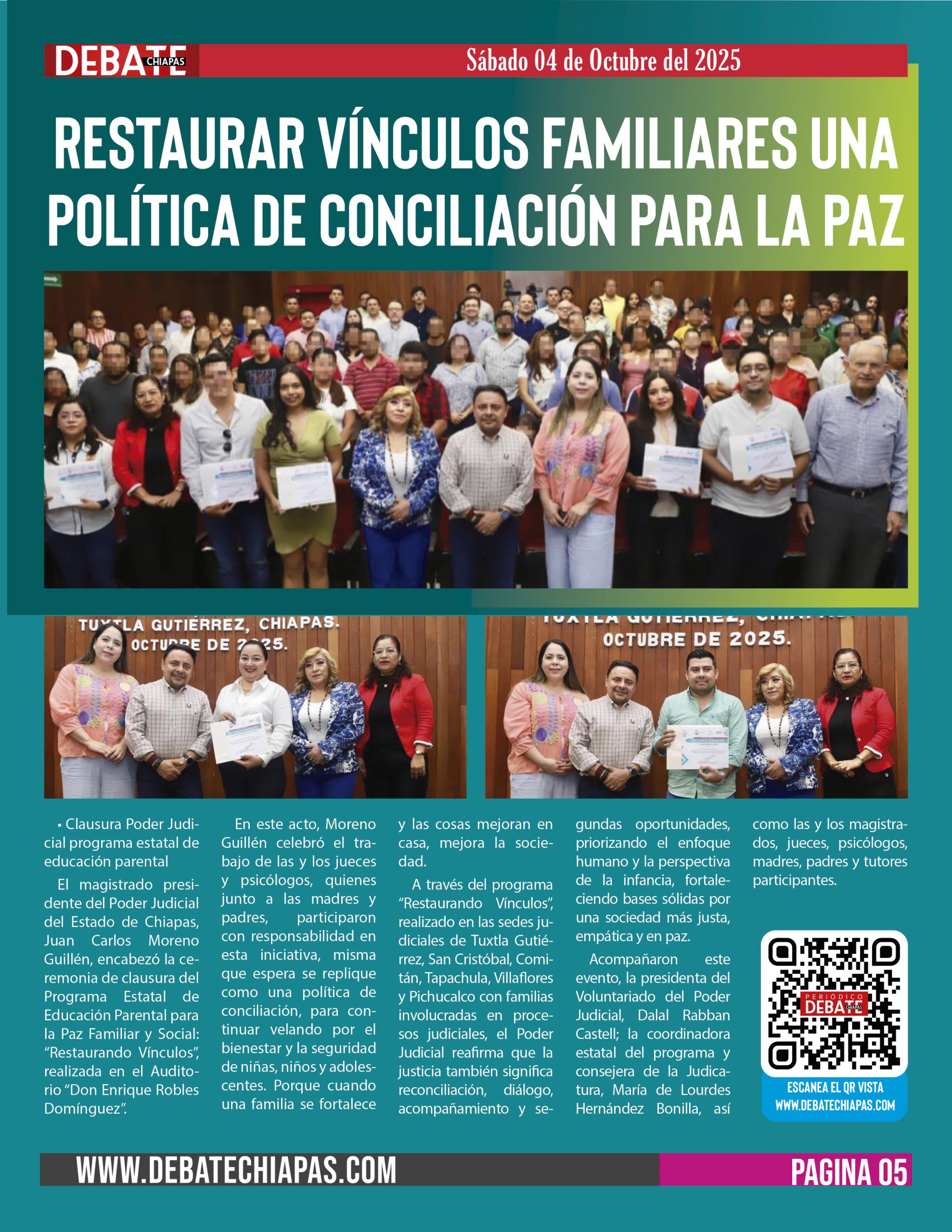 A través del programa “Restaurando Vínculos”, realizado en las sedes judiciales de Tuxtla Gutiérrez, San Cristóbal, Comitán, Tapachula, Villaflores y Pichucalco con familias involucradas en procesos judiciales, el Poder Judicial reafirma que la justicia también significa reconciliación, diálogo, acompañamiento y segundas oportunidades, priorizando el enfoque humano y la perspectiva de la infancia, fortaleciendo bases sólidas por una sociedad más justa, empática y en paz.
