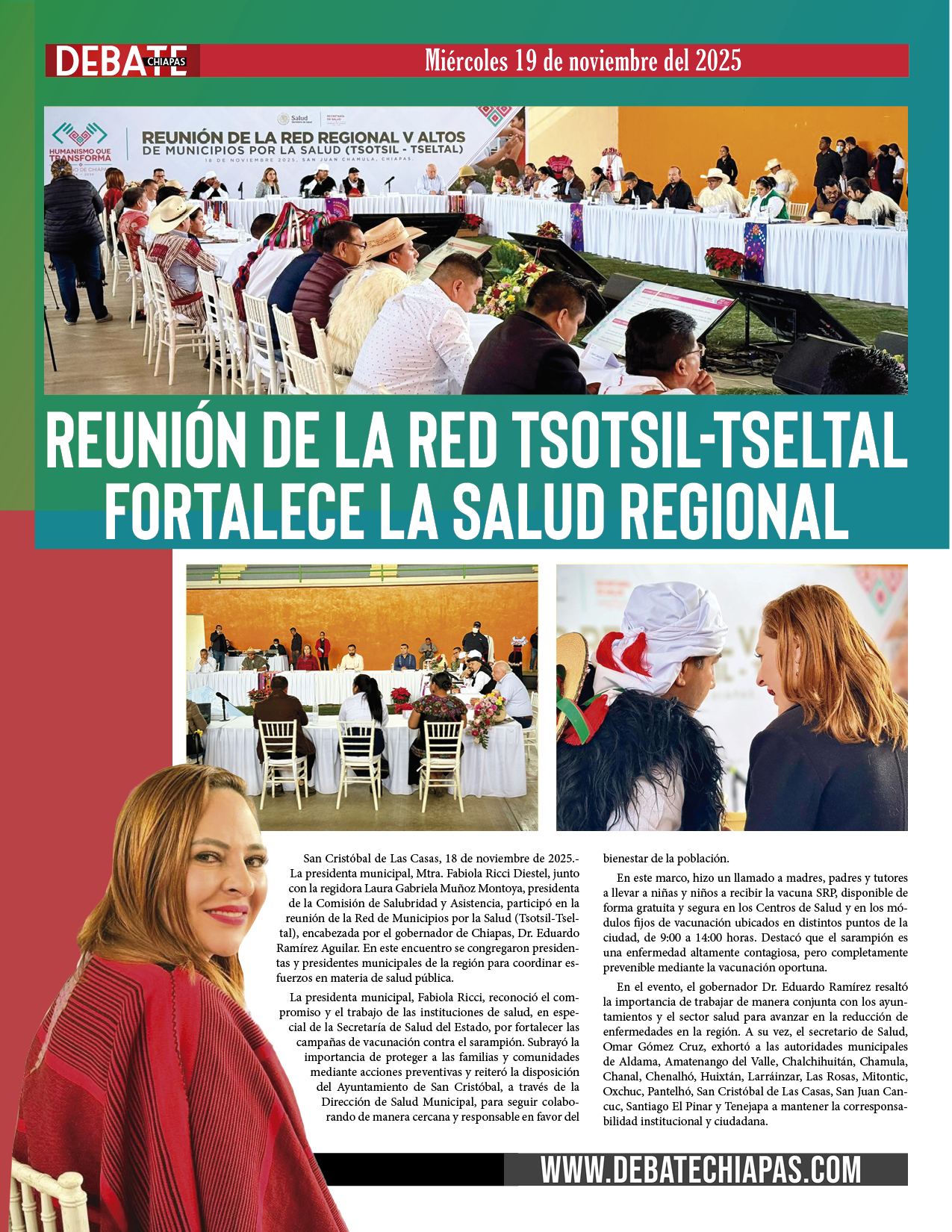 San Cristóbal de Las Casas, 18 de noviembre de 2025.- La presidenta municipal, Mtra. Fabiola Ricci Diestel, junto con la regidora Laura Gabriela Muñoz Montoya, presidenta de la Comisión de Salubridad y Asistencia, participó en la reunión de la Red de Municipios por la Salud (Tsotsil-Tseltal), encabezada por el gobernador de Chiapas, Dr. Eduardo Ramírez Aguilar. En este encuentro se congregaron presidentas y presidentes municipales de la región para coordinar esfuerzos en materia de salud pública.