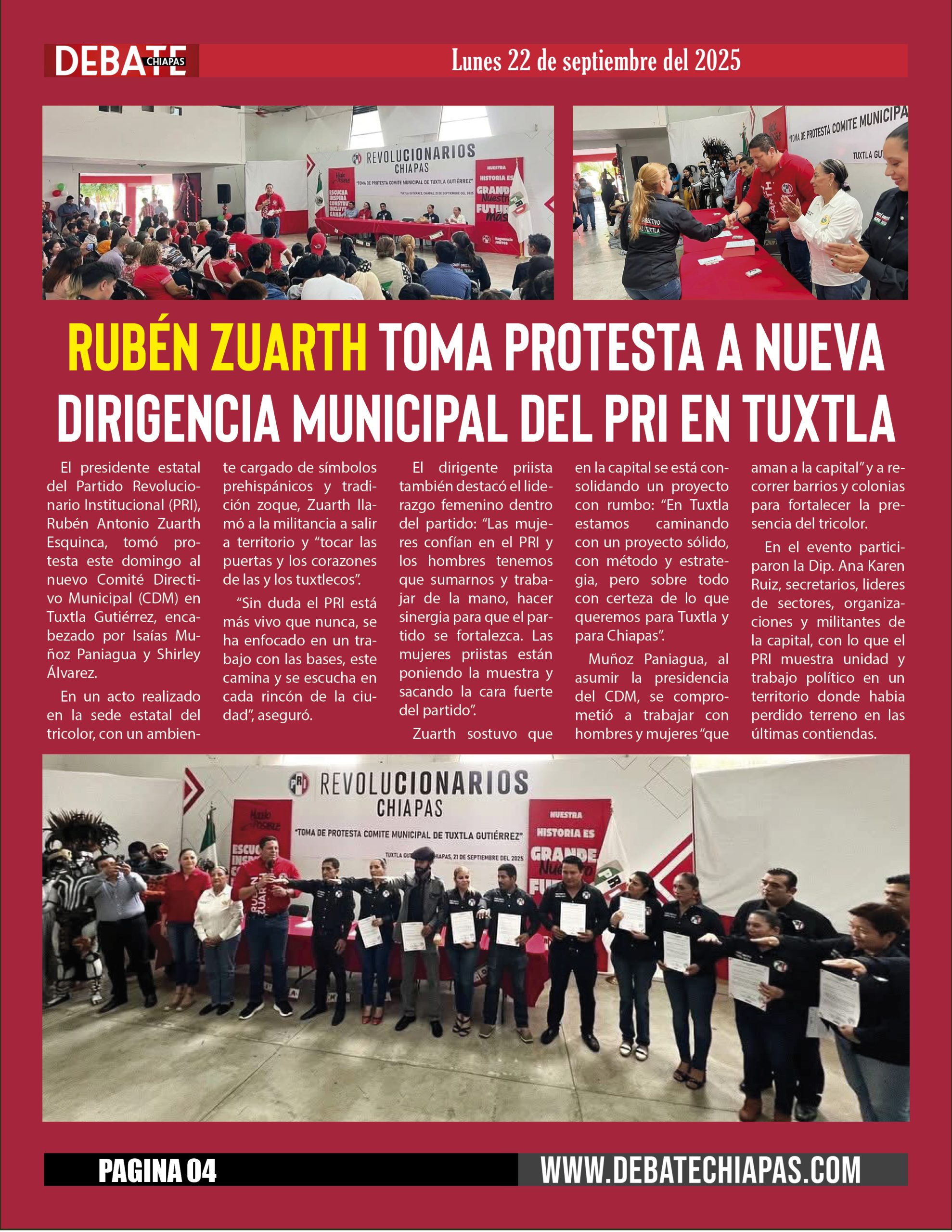 El presidente estatal del Partido Revolucionario Institucional (PRI), Rubén Antonio Zuarth Esquinca, tomó protesta este domingo al nuevo Comité Directivo Municipal (CDM) en Tuxtla Gutiérrez, encabezado por Isaías Muñoz Paniagua y Shirley Álvarez.