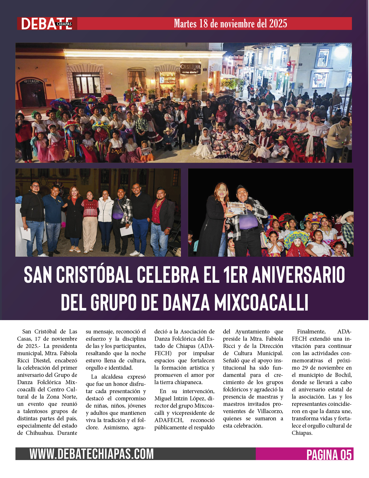 San Cristóbal de Las Casas, 17 de noviembre de 2025.- La presidenta municipal, Mtra. Fabiola Ricci Diestel, encabezó la celebración del primer aniversario del Grupo de Danza Folclórica Mixcoacalli del Centro Cultural de la Zona Norte, un evento que reunió a talentosos grupos de distintas partes del país, especialmente del estado de Chihuahua. Durante su mensaje, reconoció el esfuerzo y la disciplina de las y los participantes, resaltando que la noche estuvo llena de cultura, orgullo e identidad.