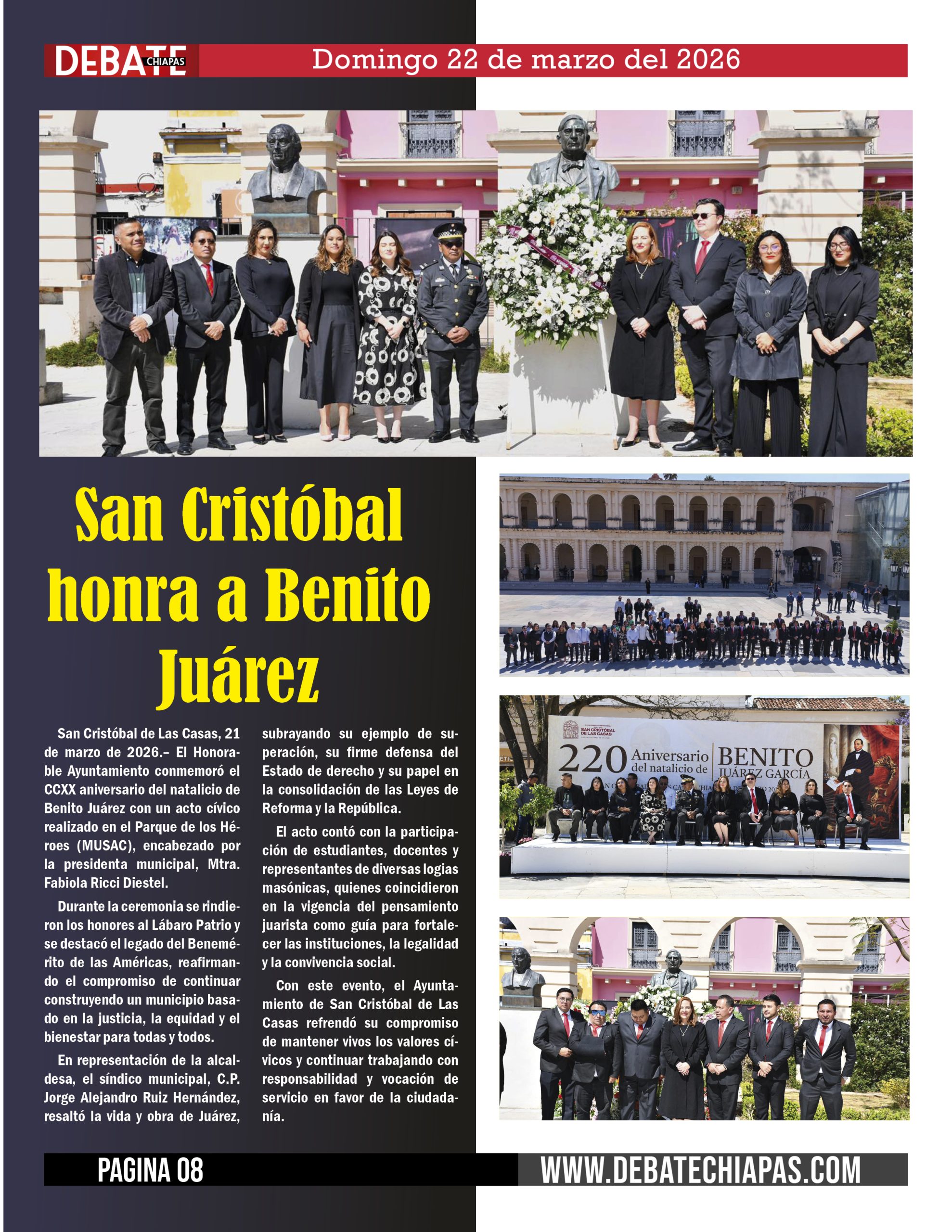 San Cristóbal de Las Casas, 21 de marzo de 2026.– El Honorable Ayuntamiento conmemoró el CCXX aniversario del natalicio de Benito Juárez con un acto cívico realizado en el Parque de los Héroes (MUSAC), encabezado por la presidenta municipal, Mtra. Fabiola Ricci Diestel.