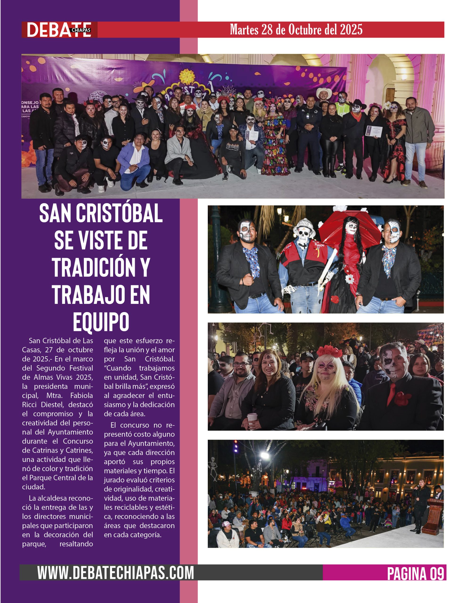 San Cristóbal de Las Casas, 27 de octubre de 2025.- En el marco del Segundo Festival de Almas Vivas 2025, la presidenta municipal, Mtra. Fabiola Ricci Diestel, destacó el compromiso y la creatividad del personal del Ayuntamiento durante el Concurso de Catrinas y Catrines, una actividad que llenó de color y tradición el Parque Central de la ciudad.