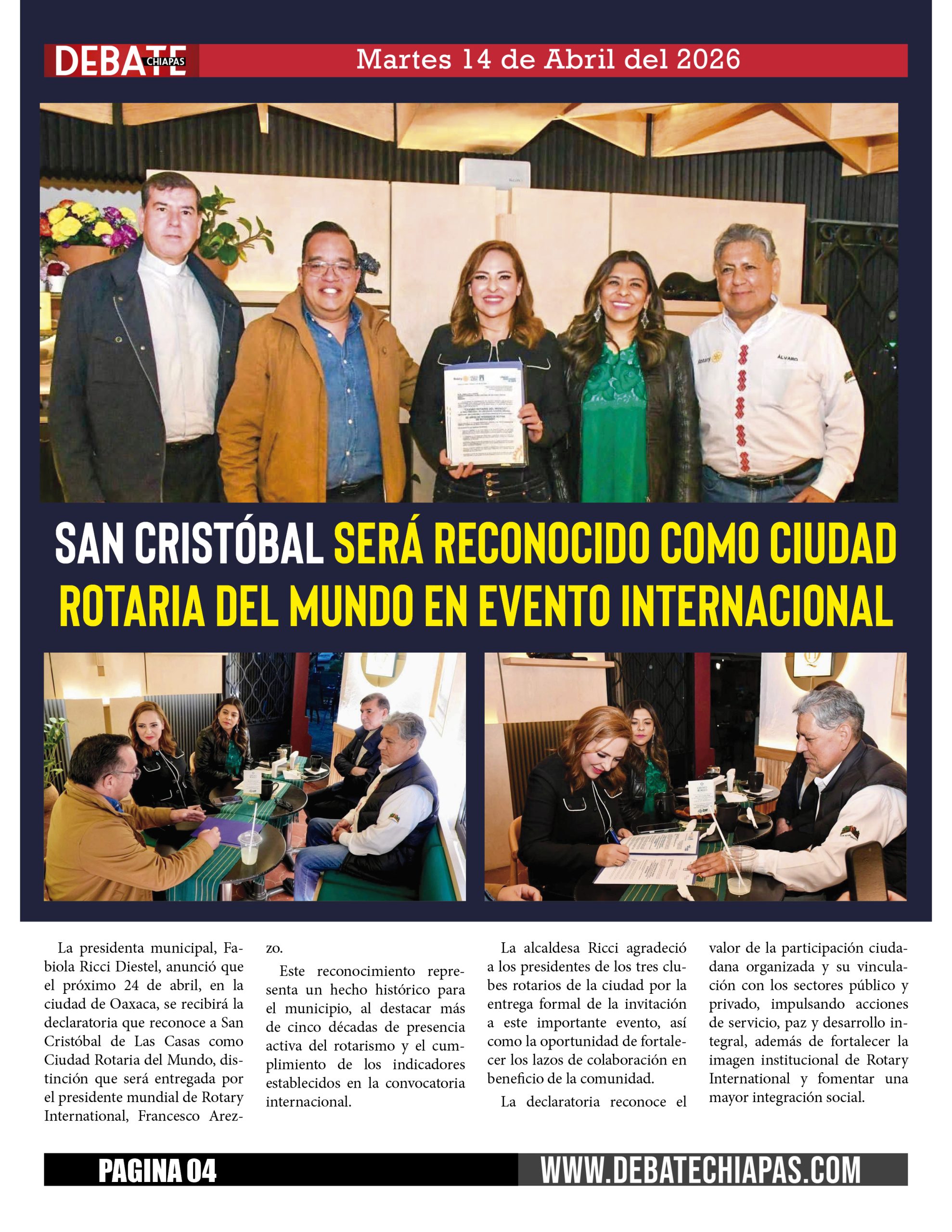 La presidenta municipal, Fabiola Ricci Diestel, anunció que el próximo 24 de abril, en la ciudad de Oaxaca, se recibirá la declaratoria que reconoce a San Cristóbal de Las Casas como Ciudad Rotaria del Mundo, distinción que será entregada por el presidente mundial de Rotary International, Francesco Arezzo.
