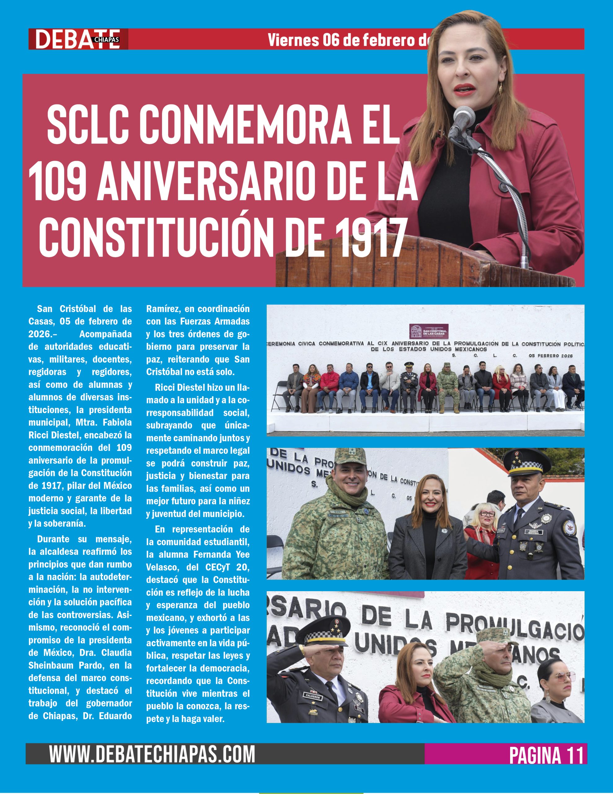 San Cristóbal de las Casas, 05 de febrero de 2026.– Acompañada de autoridades educativas, militares, docentes, regidoras y regidores, así como de alumnas y alumnos de diversas instituciones, la presidenta municipal, Mtra. Fabiola Ricci Diestel, encabezó la conmemoración del 109 aniversario de la promulgación de la Constitución de 1917, pilar del México moderno y garante de la justicia social, la libertad y la soberanía.