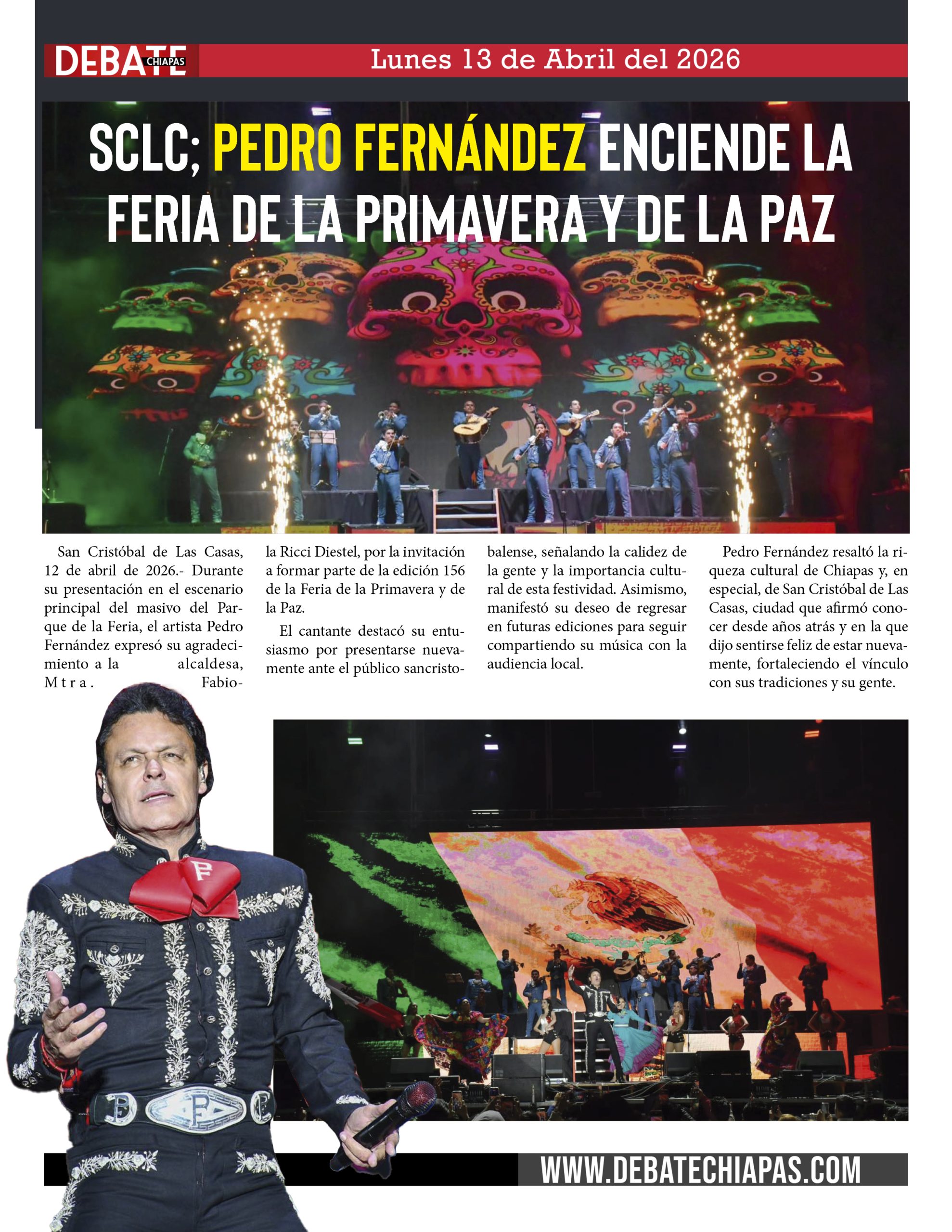 San Cristóbal de Las Casas, 12 de abril de 2026.- Durante su presentación en el escenario principal del masivo del Parque de la Feria, el artista Pedro Fernández expresó su agradecimiento a la alcaldesa, Mtra. Fabiola Ricci Diestel, por la invitación a formar parte de la edición 156 de la Feria de la Primavera y de la Paz.